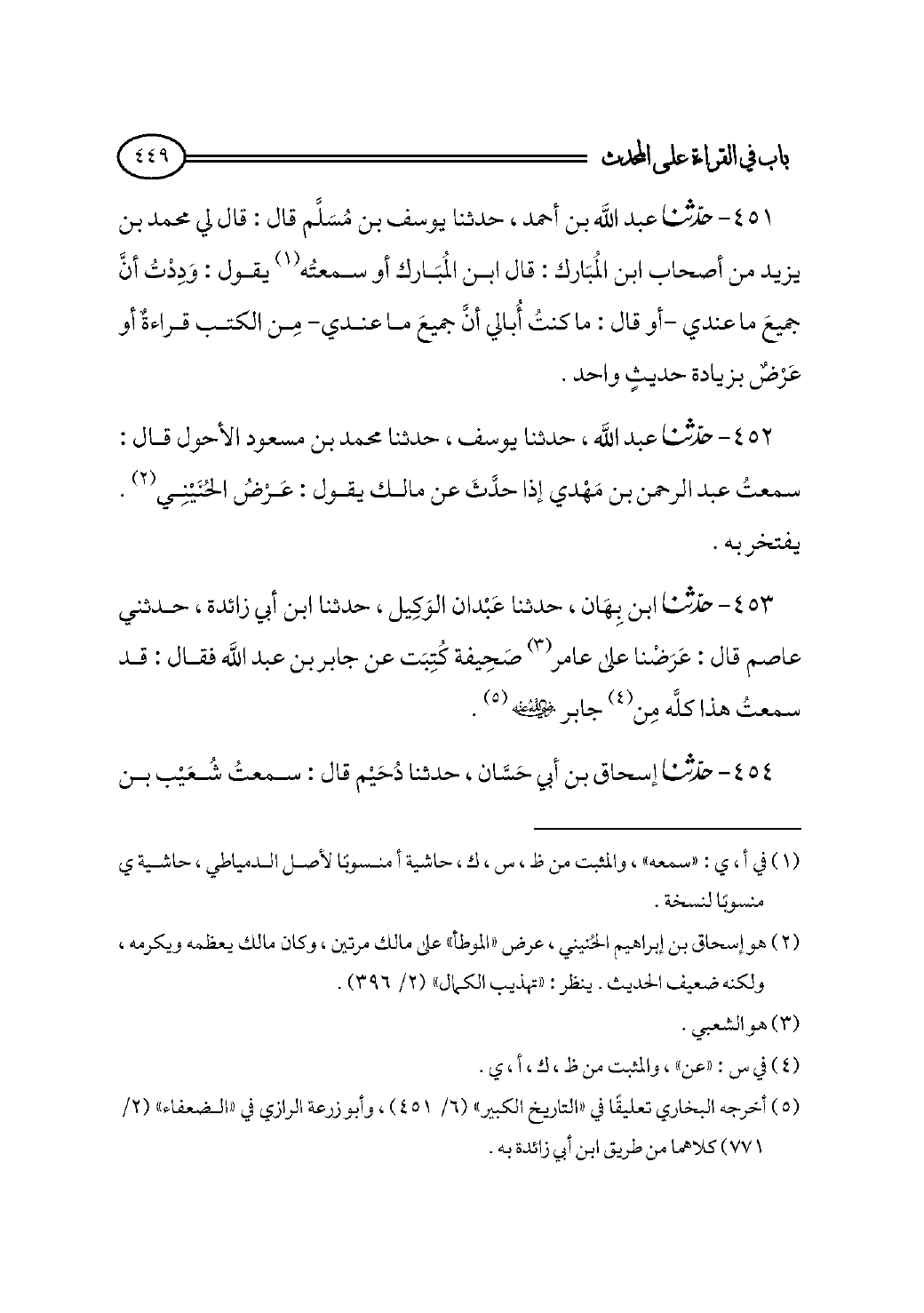 ٤٥٣ - حدثنا ابن بِهَان، حدثنا عَبْدان الوَكِيل، حدثنا ابن أبي زائدة، حدثني عاصم قال: عَرَضْنا على عامر (¬٣) صَحِيفة كُتِبَت عن جابر بن عبد الله فقال: قد سمعتُ هذا كلَّه مِن (¬٤) جابر - رضي الله عنه - (¬٥).