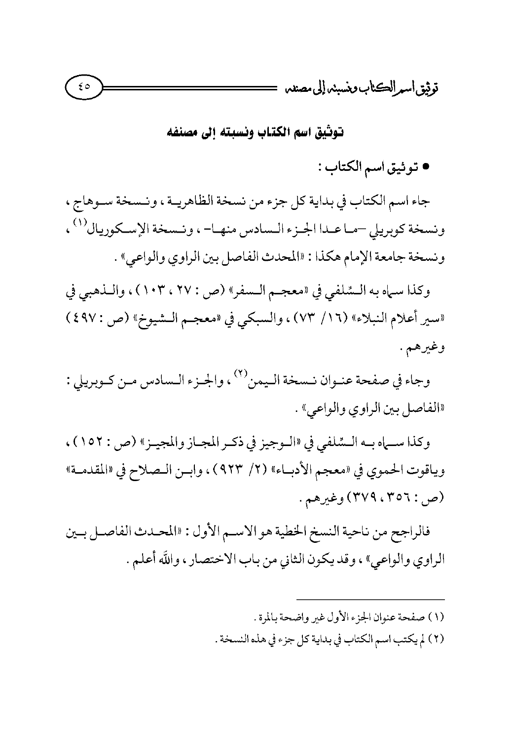 فالراجح من ناحية النسخ الخطية هو الاسم الأول: «المحدث الفاصل بين الراوي والواعي»، وقد يكون الثاني من باب الاختصار، والله أعلم.