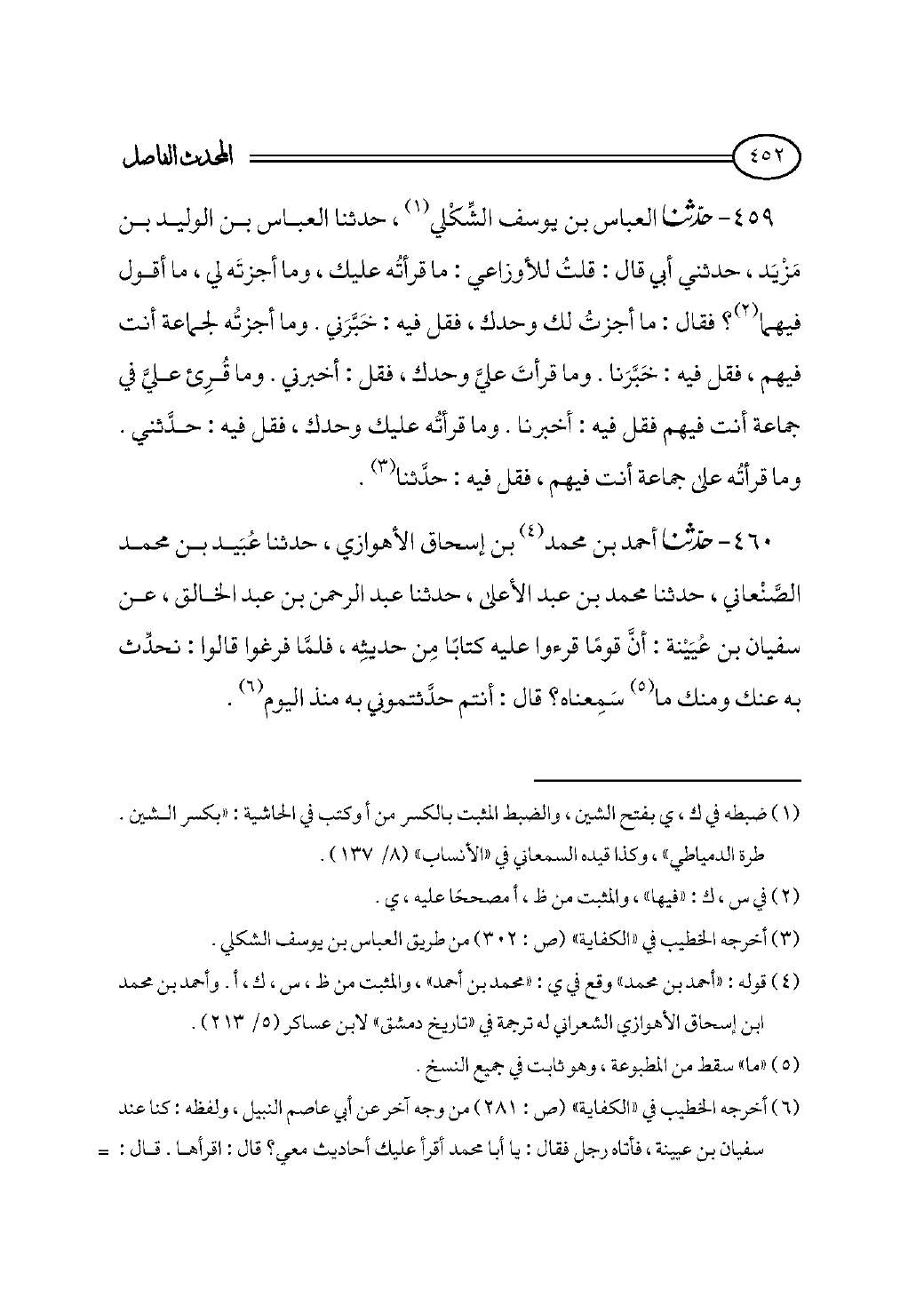٤٥٩ - حدثنا العباس بن يوسف الشِّكْلي (¬١)، حدثنا العباس بن الوليد بن مَزْيَد، حدثني أبي قال: قلتُ للأوزاعي: ما قرأتُه عليك، وما أجزتَه لي، ما أقول فيهما (¬٢)؟ فقال: ما أجزتُ لك وحدك، فقل فيه: خَبَّرَني. وما أجزتُه لجماعة أنت فيهم، فقل فيه: خَبَّرَنا. وما قرأتَ عليَّ وحدك، فقل: أخبرني. وما قُرِئ عليَّ في جماعة أنت فيهم فقل فيه: أخبرنا. وما قرأتُه عليك وحدك، فقل فيه: حدَّثني. وما قرأتُه على جماعة أنت فيهم، فقل فيه: حدَّثنا (¬٣).