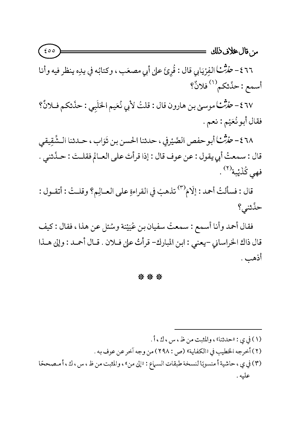 فقال أحمد وأنا أسمع: سمعتُ سفيان بن عُيَيْنة وسُئل عن هذا، فقال: كيف قال ذاك الخراساني -يعني: ابن المبارك- قرأتُ على فلان. قال أحمد: وإلى هذا أذهب.