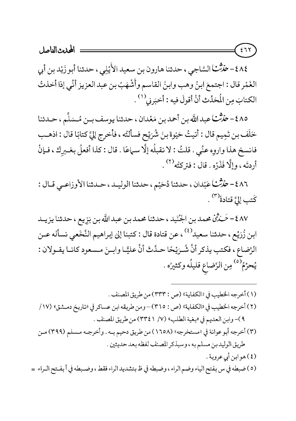 ٤٨٥ - حدثنا عبد الله بن أحمد بن مَعْدان، حدثنا يوسف بن مُسَلَّم، حدثنا خَلَف بن تَمِيم قال: أتيتُ حَيْوةَ بنَ شُرَيْح فسألتُه، فأخرج إليَّ كتابًا قال: اذهب فانسخ هذا واروِه عنِّي. قلتُ: لا نقبلُه إلَّا سماعًا. قال: كذا أفعلُ بغيرِك، فإنْ أردتَه، وإلَّا فَذَرْه. قال: فتركتُه (¬٢).