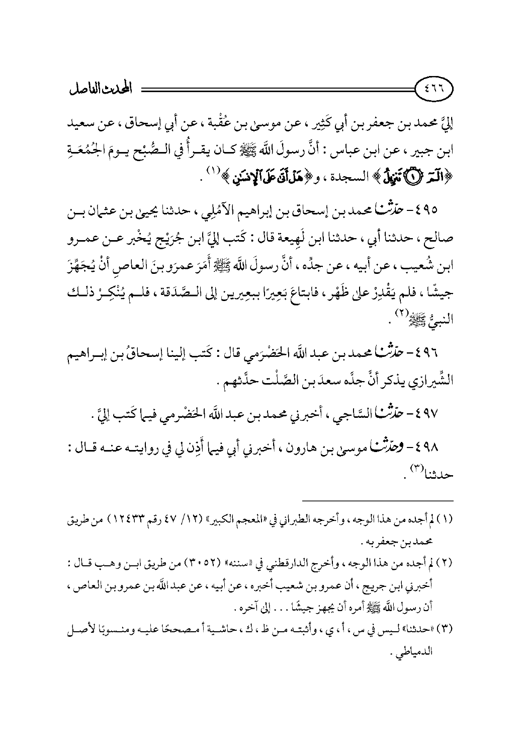 إليَّ محمد بن جعفر بن أبي كَثِير، عن موسى بن عُقْبة، عن أبي إسحاق، عن سعيد ابن جبير، عن ابن عباس: أنَّ رسولَ الله - صلى الله عليه وسلم - كان يقرأُ في الصُّبْح يومَ الجُمُعَةِ {الم (١) تَنْزِيلُ} السجدة، و {هَلْ أَتَى عَلَى الْإِنْسَانِ} (¬١).