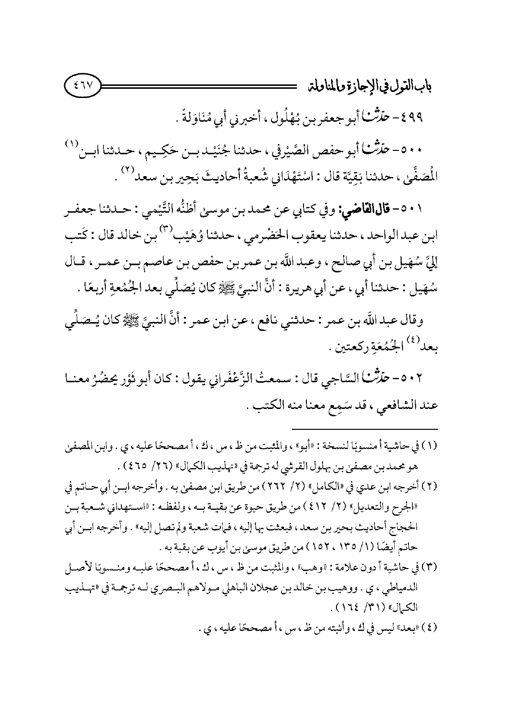 ٥٠١ - قال القاضي: وفي كتابي عن محمد بن موسى أظنُّه التَّيْمي: حدثنا جعفر ابن عبد الواحد، حدثنا يعقوب الحَضْرمي، حدثنا وُهَيْب (¬٣) بن خالد قال: كَتب إليَّ سُهَيل بن أبي صالح، وعبد الله بن عمر بن حفص بن عاصم بن عمر، قال سُهَيل: حدثنا أبي، عن أبي هريرة: أنَّ النبيَّ - صلى الله عليه وسلم - كان يُصَلِّي بعد الجُمُعةِ أربعًا.