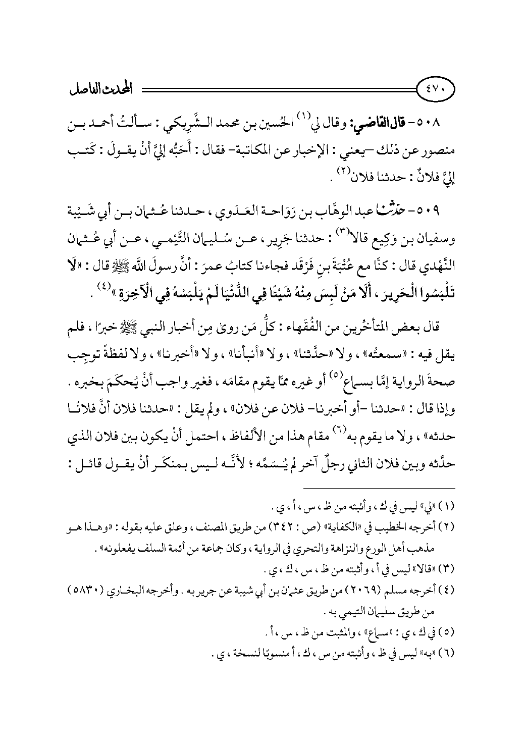 ٥٠٨ - قال القاضي: وقال لي (¬١) الحُسين بن محمد الشَّرِيكي: سألتُ أحمد بن منصور عن ذلك -يعني: الإخبار عن المكاتبة- فقال: أَحَبُّه إليَّ أنْ يقولَ: كَتب إليَّ فلانٌ: حدثنا فلان (¬٢).