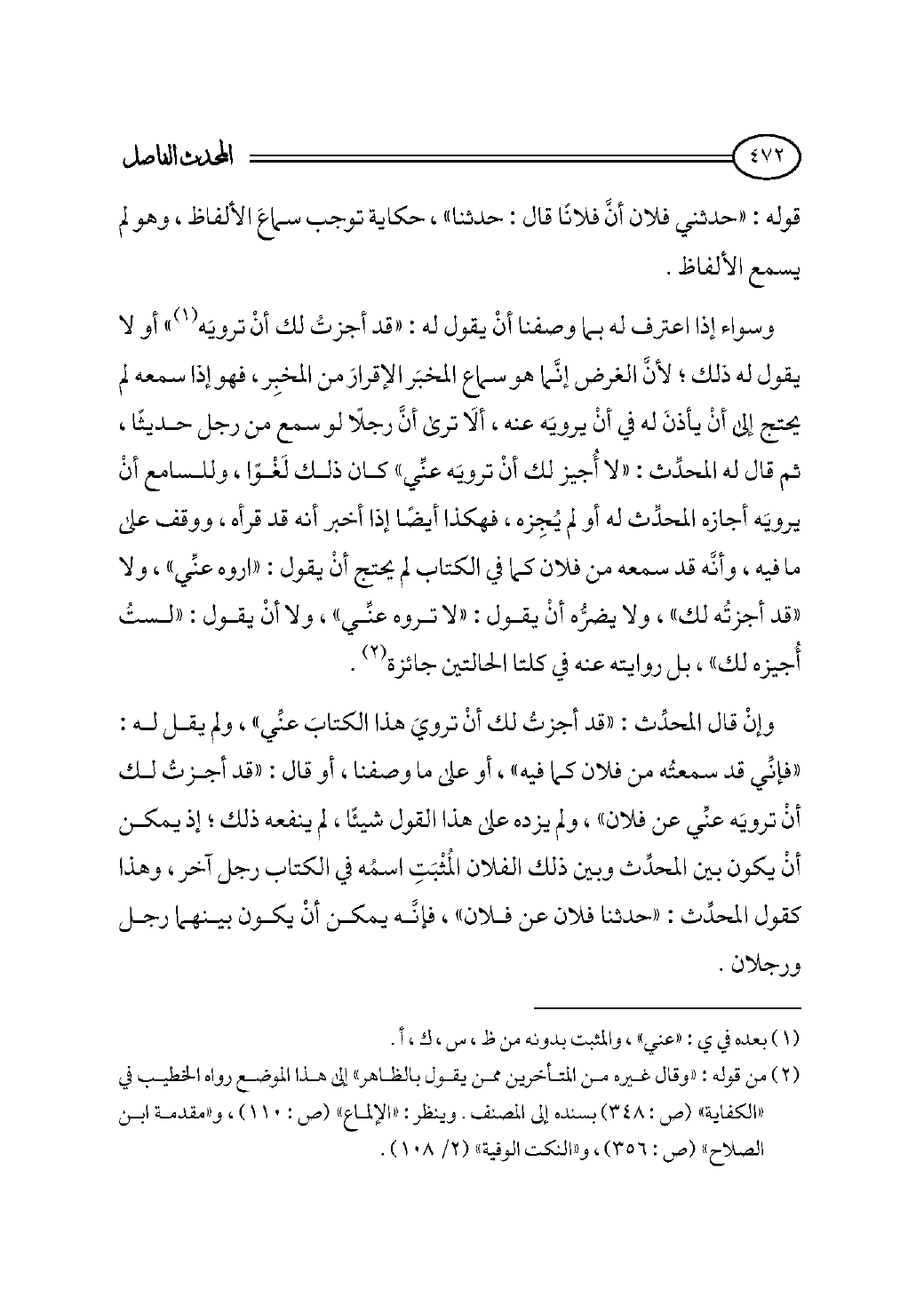 وسواء إذا اعترف له بما وصفنا أنْ يقول له: «قد أجزتُ لك أنْ ترويَه (¬١)» أو لا يقول له ذلك؛ لأنَّ الغرض إنَّما هو سماع المخبَر الإقرارَ من المخبِر، فهو إذا سمعه لم يحتج إلى أنْ يأذنَ له في أنْ يرويَه عنه، ألَا ترى أنَّ رجلًا لو سمع من رجل حديثًا، ثم قال له المحدِّث: «لا أُجيز لك أنْ ترويَه عنِّي» كان ذلك لَغْوًا، وللسامع أنْ يرويَه أجازه المحدِّث له أو لم يُجِزه، فهكذا أيضًا إذا أخبر أنه قد قرأه، ووقف على ما فيه، وأنَّه قد سمعه من فلان كما في الكتاب لم يحتج أنْ يقول: «اروه عنِّي»، ولا «قد أجزتُه لك»، ولا يضرُّه أنْ يقول: «لا تروه عنِّي»، ولا أنْ يقول: «لستُ أُجيزه لك»، بل روايته عنه في كلتا الحالتين جائزة (¬٢).