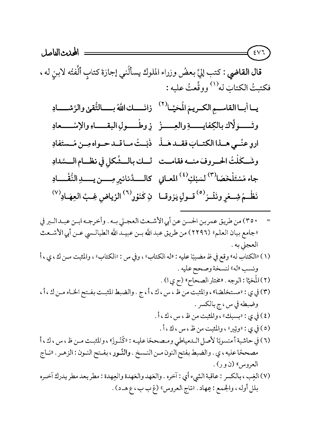 قال القاضي: كتب إليَّ بعضُ وزراء الملوك يسألُني إجازةَ كتابٍ ألَّفتُه لابنٍ له، فكتبتُ الكتابَ له (¬١) ووقَّعتُ عليه: