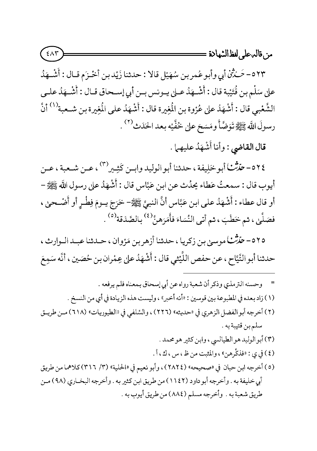 ٥٢٣ - حدثني أبي وأبو عُمر بن سُهَيْل قالا: حدثنا زَيْد بن أخْزَم قال: أَشْهَدُ على سَلْم بن قُتَيْبة قال: أَشْهَدُ على يونس بن أبي إسحاق قال: أَشْهَدُ على الشَّعْبي قال: أَشْهَدُ على عُرْوة بن المُغِيرة قال: أَشْهَدُ على المُغِيرة بن شعبة (¬١) أنَّ رسولَ الله - صلى الله عليه وسلم - تَوَضَّأَ ومَسَحَ على خُفَّيْه بعد الحَدَث (¬٢).