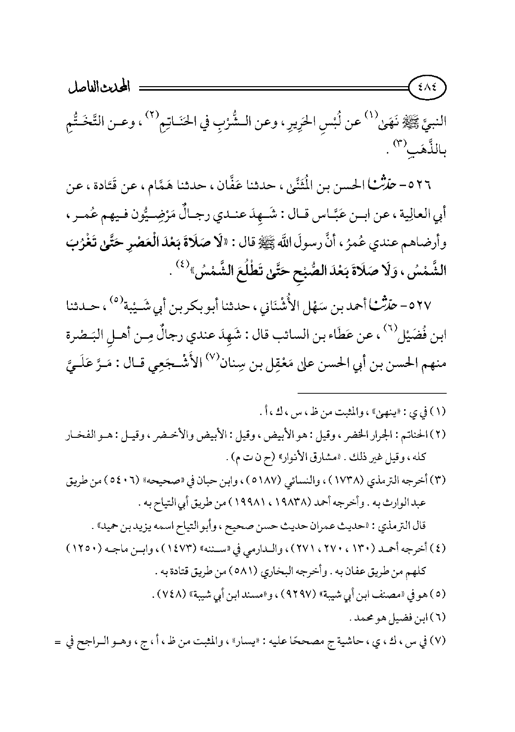 ٥٢٦ - حدثنا الحسن بن المُثَنَّى، حدثنا عَفَّان، حدثنا هَمَّام، عن قَتَادة، عن أبي العالِية، عن ابن عَبَّاس قال: شَهِدَ عندي رجالٌ مَرْضِيُّون فيهم عُمر، وأرضاهم عندي عُمرُ، أنَّ رسولَ الله - صلى الله عليه وسلم - قال: «لَا صَلَاةَ بَعْدَ الْعَصْرِ حَتَّى تَغْرُبَ الشَّمْسُ، وَلَا صَلَاةَ بَعْدَ الصُّبْحِ حَتَّى تَطْلُعَ الشَّمْسُ» (¬٤).