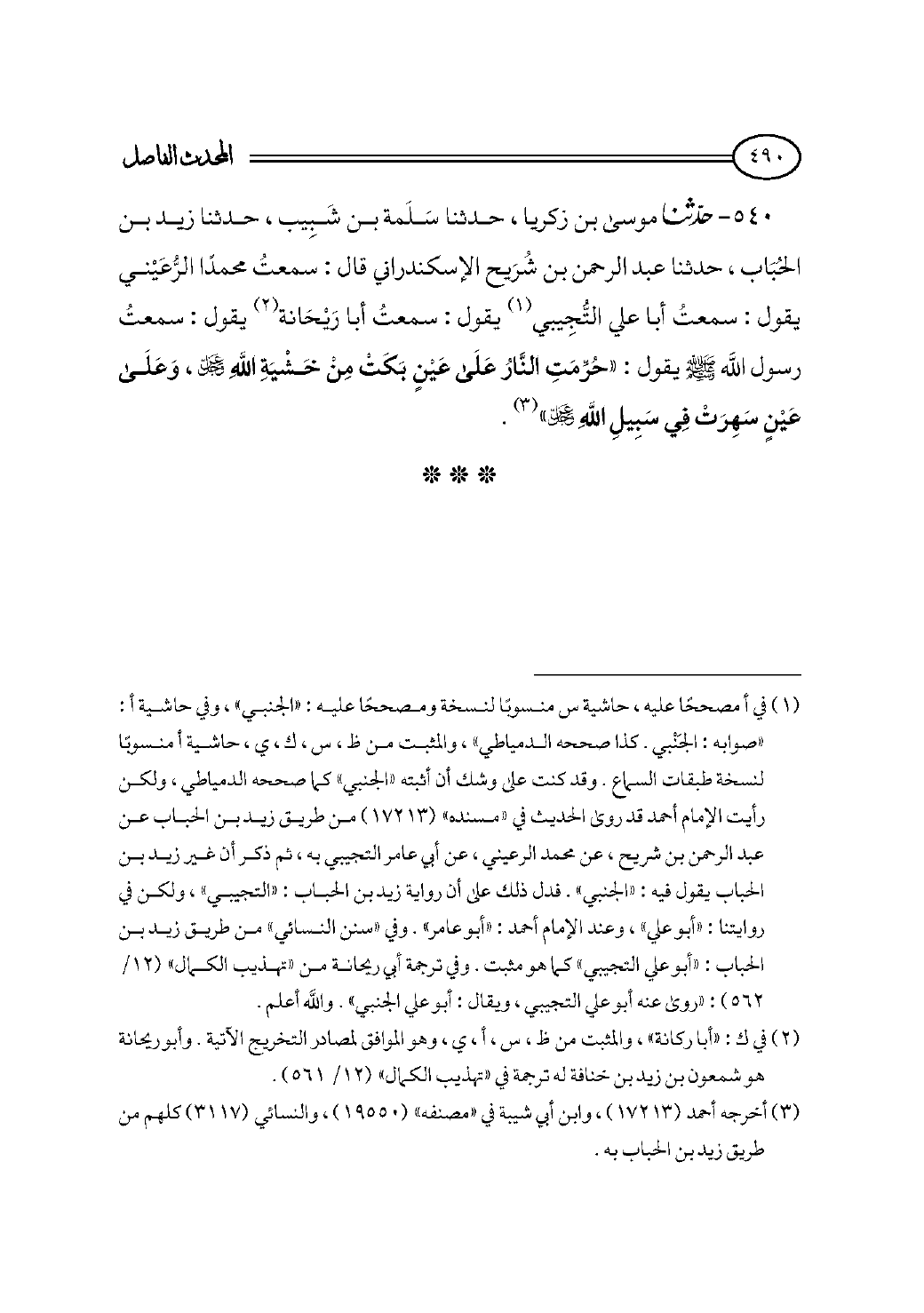 ٥٤٠ - حدثنا موسى بن زكريا، حدثنا سَلَمة بن شَبِيب، حدثنا زيد بن الحُبَاب، حدثنا عبد الرحمن بن شُرَيح الإسكندراني قال: سمعتُ محمدًا الرُّعَيْني يقول: سمعتُ أبا علي التُّجِيبي (¬١) يقول: سمعتُ أبا رَيْحَانة (¬٢) يقول: سمعتُ رسول الله - صلى الله عليه وسلم - يقول: «حُرِّمَتِ النَّارُ عَلَى عَيْنٍ بَكَتْ مِنْ خَشْيَةِ اللهِ - عز وجل -، وَعَلَى عَيْنٍ سَهِرَتْ فِي سَبِيلِ اللهِ - عز وجل -» (¬٣).