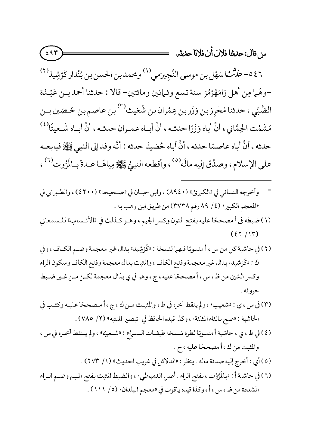 ٥٤٦ - حدثنا سَهْل بن موسى النَّجِيرَمي (¬١) ومحمد بن الحسن بن بُنْدار كَرْشِيذ (¬٢) -وهُما مِن أهل رَامَهُرْمُز سنة تسع وثمانين ومائتين- قالا: حدثنا أحمد بن عَبْدَة الضَّبِّي، حدثنا مُحْرِز بن وَزَر بن عِمْران بن شُعَيث (¬٣) بن عاصم بن حُصَين بن مُشَمِّت الحِمَّاني، أنَّ أباه وَزَرًا حدثه، أنَّ أباه عمران حدثه، أنَّ أباه شُعيثًا (¬٤) حدثه، أنَّ أباه عاصمًا حدثه، أنَّ أباه حُصَينًا حدثه: أنَّه وفد إلى النبي - صلى الله عليه وسلم - فبايعه على الإسلام، وصدَّق إليه مالَه (¬٥)، وأقطعه النبيُّ - صلى الله عليه وسلم - مِياهًا عدةً بالمَرُّوت (¬٦)،