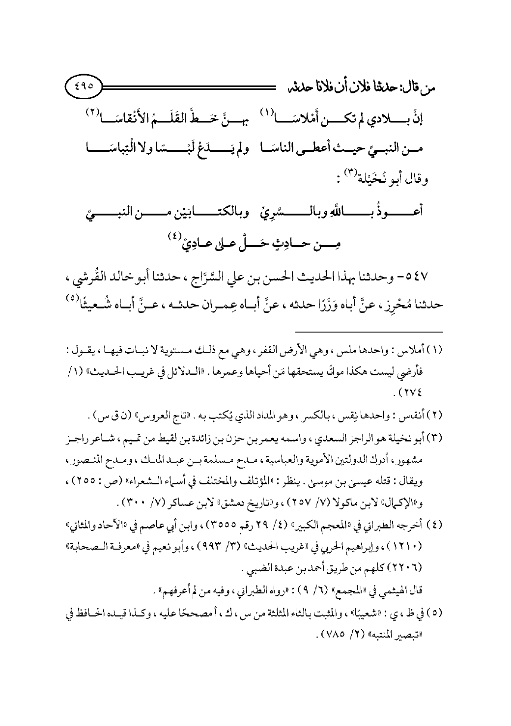 (¬٣) أبو نخيلة هو الراجز السعدي، واسمه يعمر بن حزن بن زائدة بن لقيط من تميم، شاعر راجز مشهور، أدرك الدولتين الأموية والعباسية، مدح مسلمة بن عبد الملك، ومدح المنصور، ويقال: قتله عيسى بن موسى. ينظر: «المؤتلف والمختلف في أسماء الشعراء» (ص: ٢٥٥)، و «الإكمال» لابن ماكولا (٧/ ٢٥٧)، و «تاريخ دمشق» لابن عساكر (٧/ ٣٠٠).