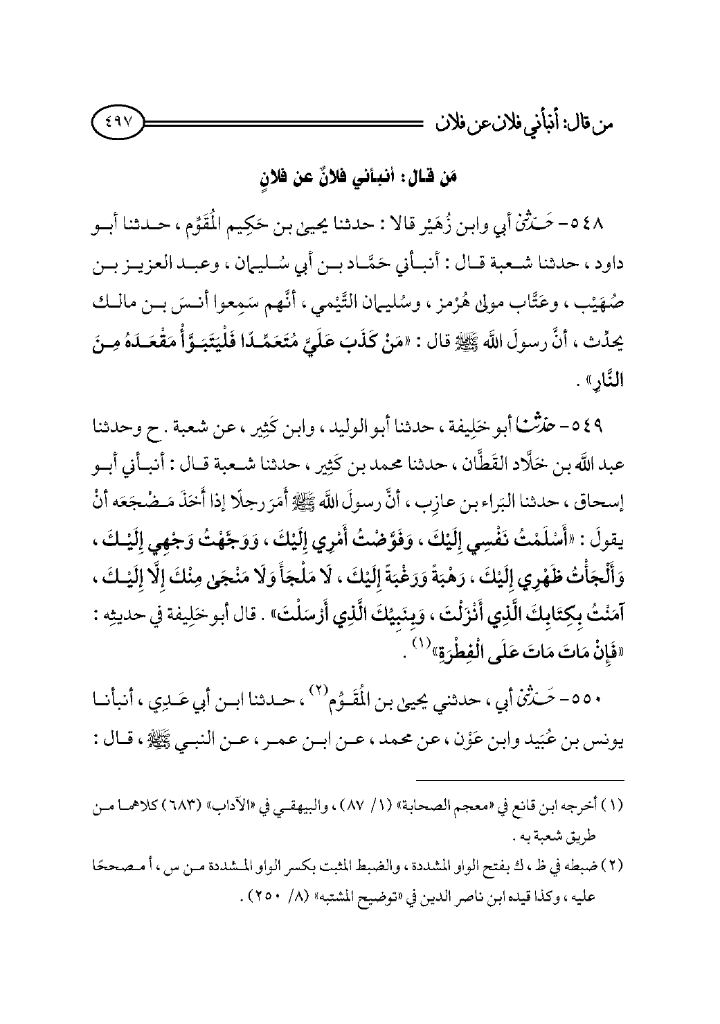 ٥٤٩ - حدثنا أبو خَلِيفة، حدثنا أبو الوليد، وابن كَثِير، عن شعبة. ح وحدثنا عبد الله بن خَلَّاد القَطَّان، حدثنا محمد بن كَثِير، حدثنا شعبة قال: أنبأني أبو إسحاق، حدثنا البَراء بن عازِب، أنَّ رسولَ الله - صلى الله عليه وسلم - أَمَرَ رجلًا إذا أَخَذَ مَضْجَعَه أنْ يقولَ: «أَسْلَمْتُ نَفْسِي إِلَيْكَ، وَفَوَّضْتُ أَمْرِي إِلَيْكَ، وَوَجَّهْتُ وَجْهِي إِلَيْكَ، وَأَلْجَأْتُ ظَهْرِي إِلَيْكَ، رَهْبَةً وَرَغْبَةً إِلَيْكَ، لَا مَلْجَأَ وَلَا مَنْجَى مِنْكَ إِلَّا إِلَيْكَ، آمَنْتُ بِكِتَابِكَ الَّذِي أَنْزَلْتَ، وَبِنَبِيِّكَ الَّذِي أَرْسَلْتَ». قال أبو خَلِيفة في حديثِه: «فَإِنْ مَاتَ مَاتَ عَلَى الْفِطْرَةِ» (¬١).