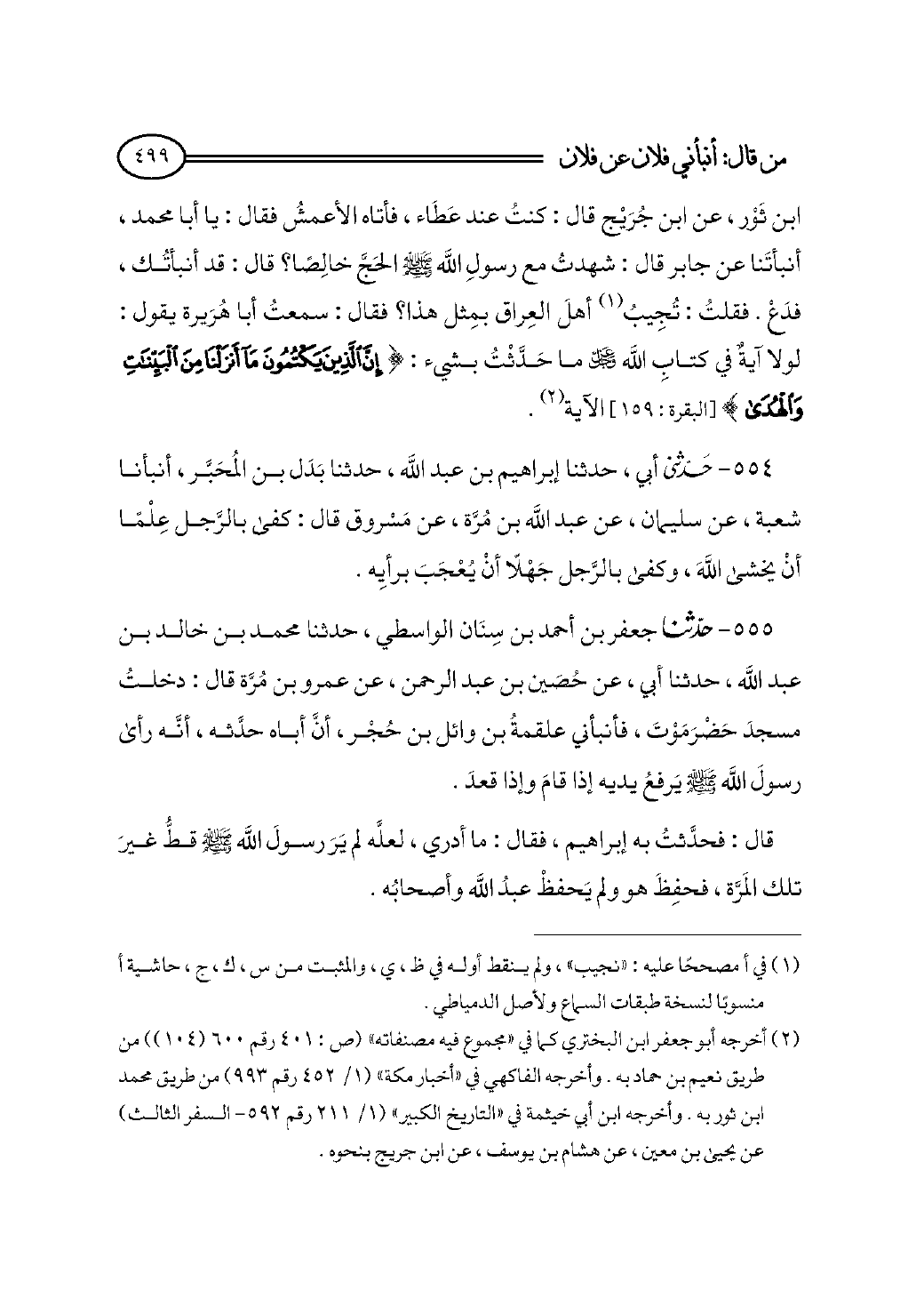 ابن ثَوْر، عن ابن جُرَيْج قال: كنتُ عند عَطَاء، فأتاه الأعمشُ فقال: يا أبا محمد، أنبأتَنا عن جابر قال: شهدتُ مع رسولِ الله - صلى الله عليه وسلم - الحَجَّ خالِصًا؟ قال: قد أنبأتُك، فدَعْ. فقلتُ: تُجِيبُ (¬١) أهلَ العِراق بمِثل هذا؟ فقال: سمعتُ أبا هُرَيرة يقول: لولا آيةٌ في كتابِ الله - عز وجل - ما حَدَّثْتُ بشيء: {إِنَّ الَّذِينَ يَكْتُمُونَ مَا أَنْزَلْنَا مِنَ الْبَيِّنَاتِ وَالْهُدَى} [البقرة: ١٥٩] الآية (¬٢).