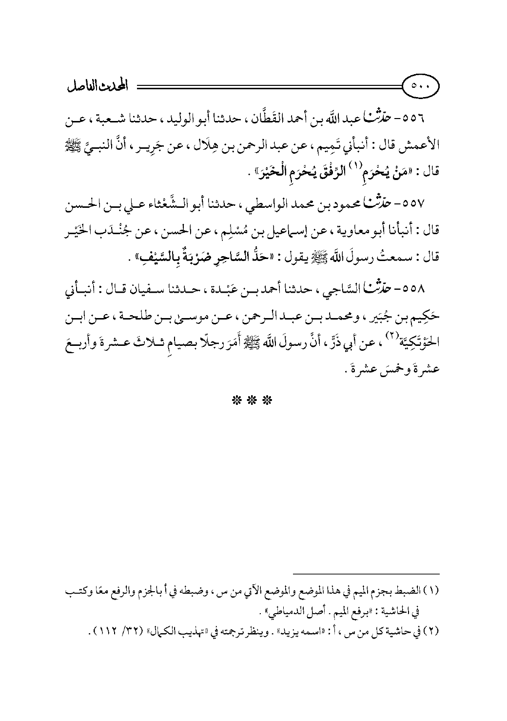 ٥٥٦ - حدثنا عبد الله بن أحمد القَطَّان، حدثنا أبو الوليد، حدثنا شعبة، عن الأعمش قال: أنبأني تَمِيم، عن عبد الرحمن بن هِلَال، عن جَرِير، أنَّ النبيَّ - صلى الله عليه وسلم - قال: «مَنْ يُحْرَمِ (¬١) الرِّفْقَ يُحْرَمِ الْخَيْرَ».