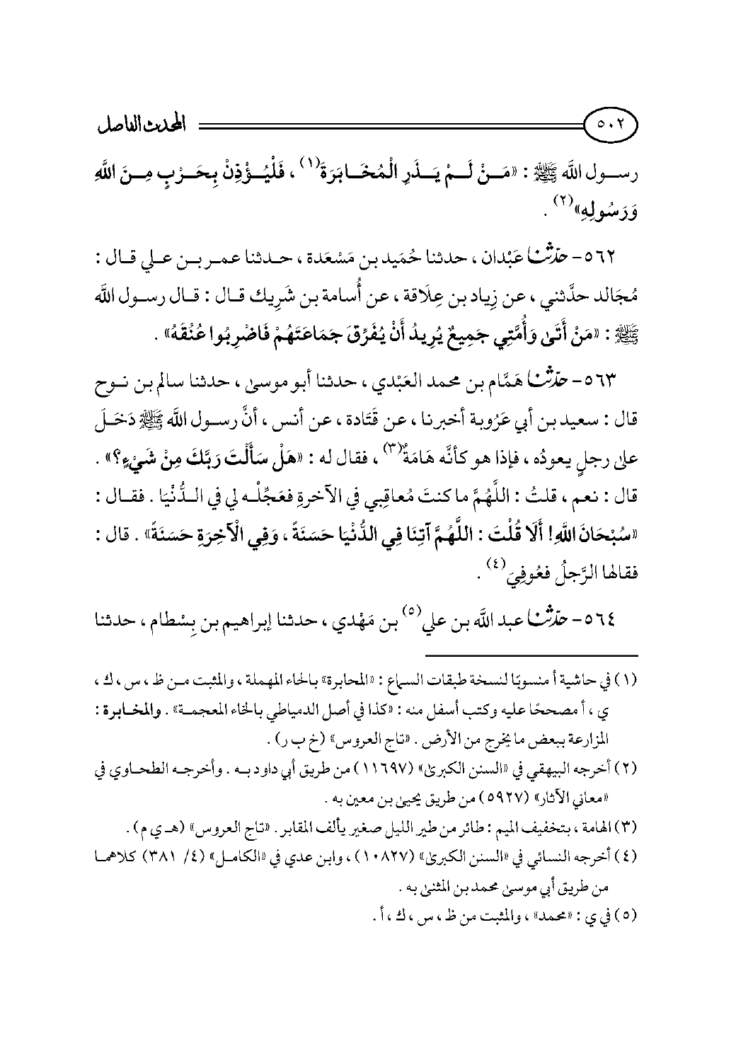 ٥٦٣ - حدثنا هَمَّام بن محمد العَبْدي، حدثنا أبو موسى، حدثنا سالم بن نوح قال: سعيد بن أبي عَرُوبة أخبرنا، عن قَتَادة، عن أنس، أنَّ رسول الله - صلى الله عليه وسلم - دَخَلَ على رجلٍ يعودُه، فإذا هو كأنَّه هَامَةٌ (¬٣)، فقال له: «هَلْ سَأَلْتَ رَبَّكَ مِنْ شَيْءٍ؟ ». قال: نعم، قلتُ: اللَّهُمَّ ما كنتَ مُعاقِبي في الآخرةِ فعَجِّلْه لي في الدُّنْيَا. فقال: «سُبْحَانَ اللهِ! أَلَا قُلْتَ: اللَّهُمَّ آتِنَا فِي الدُّنْيَا حَسَنَةً، وَفِي الْآخِرَةِ حَسَنَةً». قال: فقالها الرَّجلُ فعُوفِيَ (¬٤).