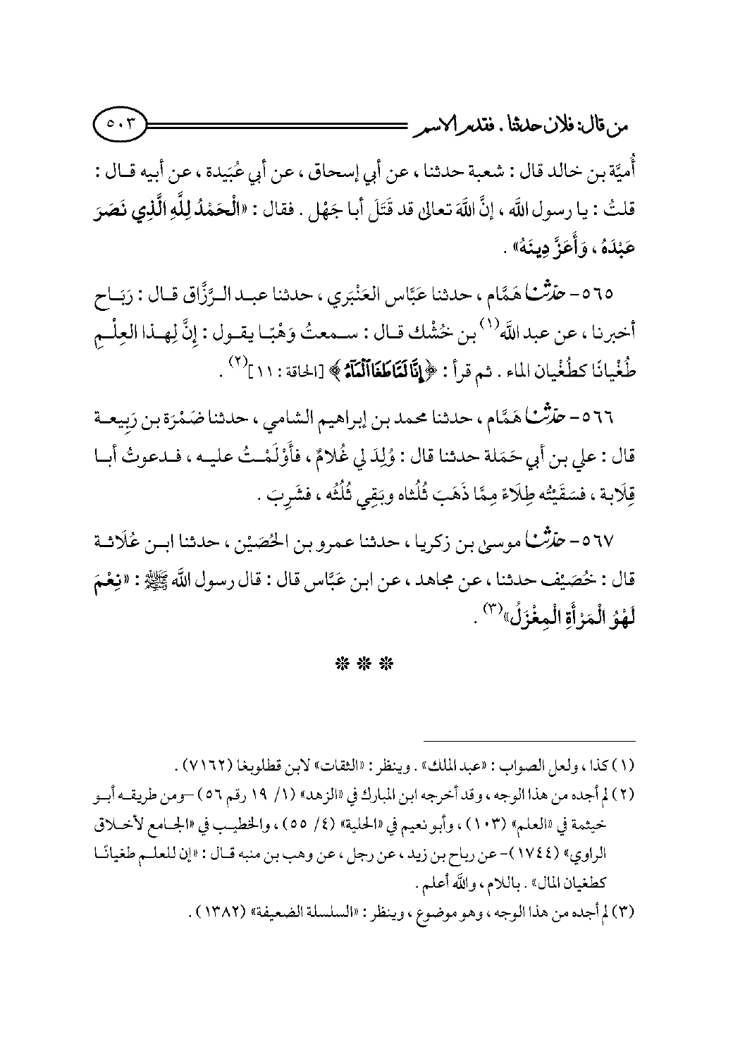٥٦٥ - حدثنا هَمَّام، حدثنا عَبَّاس العَنْبَري، حدثنا عبد الرَّزَّاق قال: رَبَاح أخبرنا، عن عبد الله (¬١) بن خُشْك قال: سمعتُ وَهْبًا يقول: إِنَّ لِهذا العِلْمِ طُغْيانًا كطُغْيان الماء. ثم قرأ: {إِنَّا لَمَّا طَغَى الْمَاءُ} [الحاقة: ١١] (¬٢).
