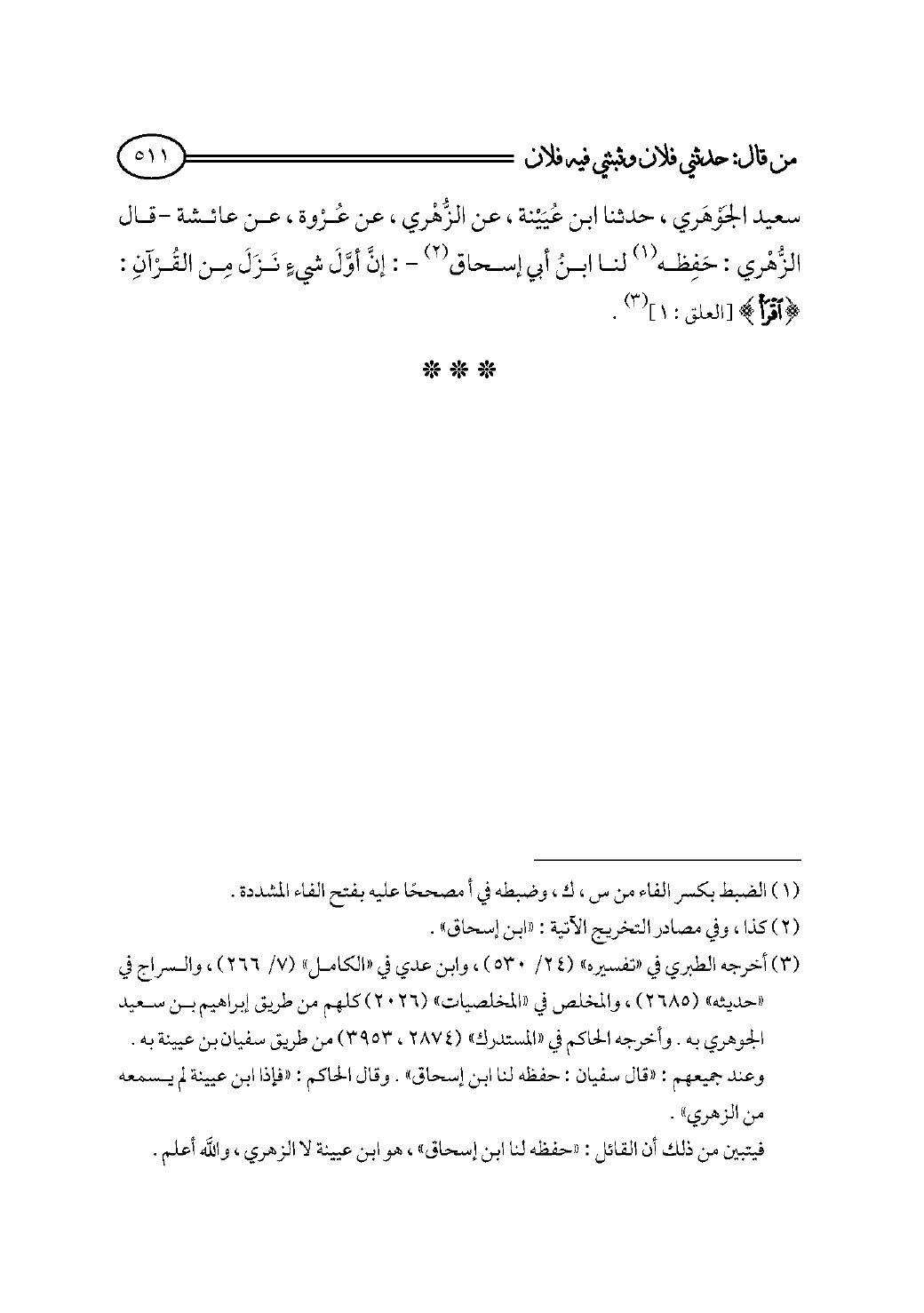 وعند جميعهم: «قال سفيان: حفظه لنا ابن إسحاق». وقال الحاكم: «فإذا ابن عيينة لم يسمعه من الزهري».