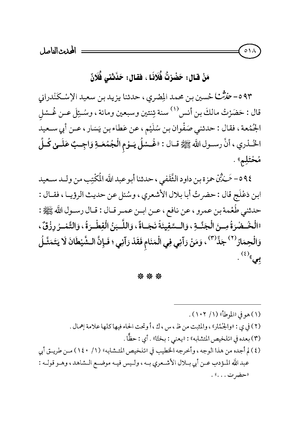 ٥٩٣ - حدثنا حُسين بن محمد المِصْري، حدثنا يزيد بن سعيد الإسْكَنْدراني قال: حَضَرْتُ مالكَ بن أنس (¬١) سنة ثِنتين وسبعين ومائة، وسُئِلَ عن غُسْلِ الجُمُعة، فقال: حدثني صَفْوان بن سُلَيْم، عن عَطاء بن يَسَار، عن أبي سعيد الخُدْري، أنَّ رسول الله - صلى الله عليه وسلم - قال: «غُسْلُ يَوْمِ الْجُمُعَةِ وَاجِبٌ عَلَى كُلِّ مُحْتَلِمٍ».