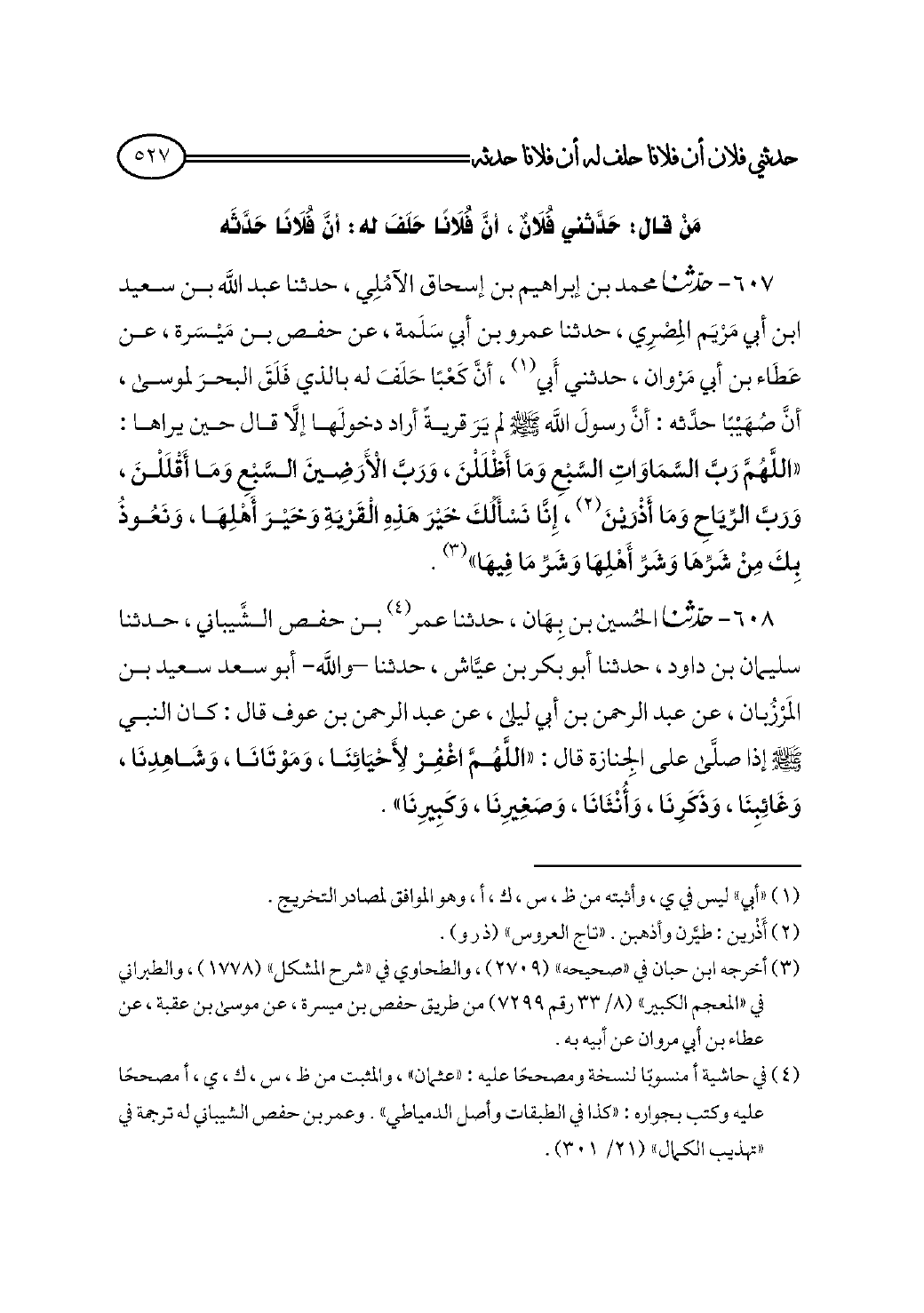 ٦٠٧ - حدثنا محمد بن إبراهيم بن إسحاق الآمُلِي، حدثنا عبد الله بن سعيد ابن أبي مَرْيَم المِصْرِي، حدثنا عمرو بن أبي سَلَمة، عن حفص بن مَيْسَرة، عن عَطَاء بن أبي مَرْوان، حدثني أَبي (¬١)، أنَّ كَعْبًا حَلَفَ له بالذي فَلَقَ البحرَ لموسى، أنَّ صُهَيْبًا حدَّثه: أنَّ رسولَ الله - صلى الله عليه وسلم - لم يَرَ قريةً أراد دخولَها إلَّا قال حين يراها: «اللَّهُمَّ رَبَّ السَّمَاوَاتِ السَّبْعِ وَمَا أَظْلَلْنَ، وَرَبَّ الْأَرَضِينَ السَّبْعِ وَمَا أَقْلَلْنَ، وَرَبَّ الرِّيَاحِ وَمَا أَذْرَيْنَ (¬٢)، إِنَّا نَسْأَلُكَ خَيْرَ هَذِهِ الْقَرْيَةِ وَخَيْرَ أَهْلِهَا، وَنَعُوذُ بِكَ مِنْ شَرِّهَا وَشَرِّ أَهْلِهَا وَشَرِّ مَا فِيهَا» (¬٣).