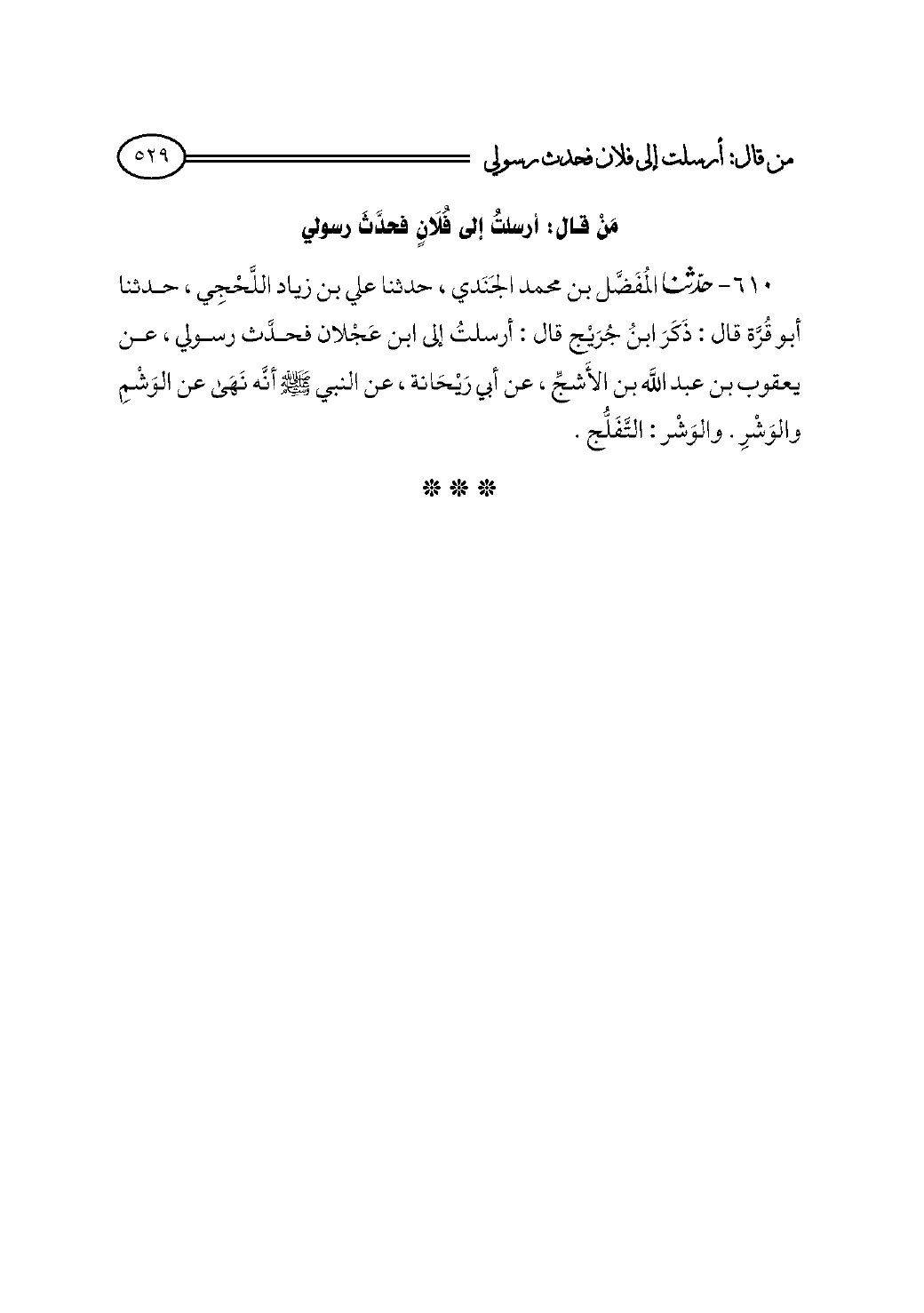 ٦١٠ - حدثنا المُفَضَّل بن محمد الجَنَدي، حدثنا علي بن زياد اللَّحْجِي، حدثنا أبو قُرَّة قال: ذَكَرَ ابنُ جُرَيْج قال: أرسلتُ إلى ابن عَجْلان فحدَّث رسولي، عن يعقوب بن عبد الله بن الأَشجِّ، عن أبي رَيْحَانة، عن النبي - صلى الله عليه وسلم - أنَّه نَهَى عن الوَشْمِ والوَشْرِ. والوَشْر: التَّفَلُّج.