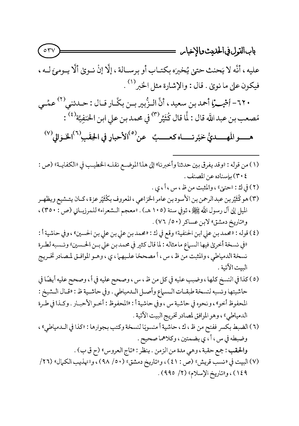 ٦٢٠ - أخبرنا أحمد بن سعيد، أنَّ الزُّبير بن بكَّار قال: حدثني (¬٢) عمِّي مُصعب بن عبد الله قال: لمَّا قال كُثَيِّر (¬٣) في محمد بن علي ابن الحَنفِيَّة (¬٤):