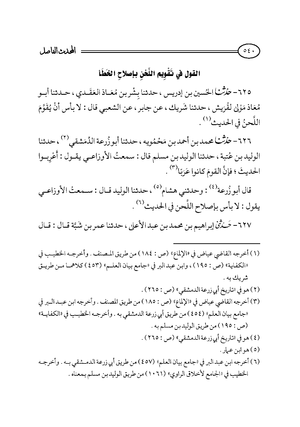 قال أبو زُرعة (¬٤): وحدثني هشام (¬٥)، حدثنا الوليد قال: سمعتُ الأوزاعي يقول: لا بأس بإصلاح اللَّحن في الحديث (¬٦).