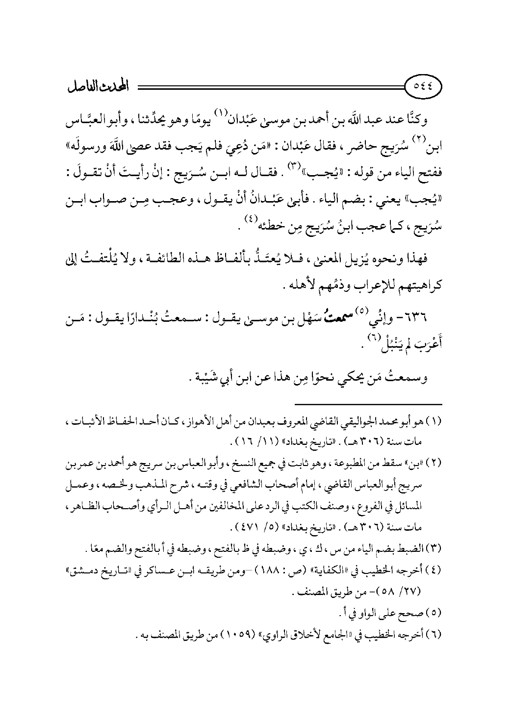 وكنَّا عند عبد الله بن أحمد بن موسى عَبْدان (¬١) يومًا وهو يحدِّثنا، وأبو العبَّاس ابن (¬٢) سُرَيج حاضر، فقال عَبْدان: «مَن دُعِيَ فلم يَجب فقد عصى اللهَ ورسولَه» ففتح الياء من قوله: «يُجب» (¬٣). فقال له ابن سُرَيج: إنْ رأيتَ أنْ تقولَ: «يُجب» يعني: بضم الياء. فأبى عَبْدانُ أنْ يقول، وعجب مِن صواب ابن سُرَيج، كما عجب ابنُ سُرَيج مِن خطئه (¬٤).