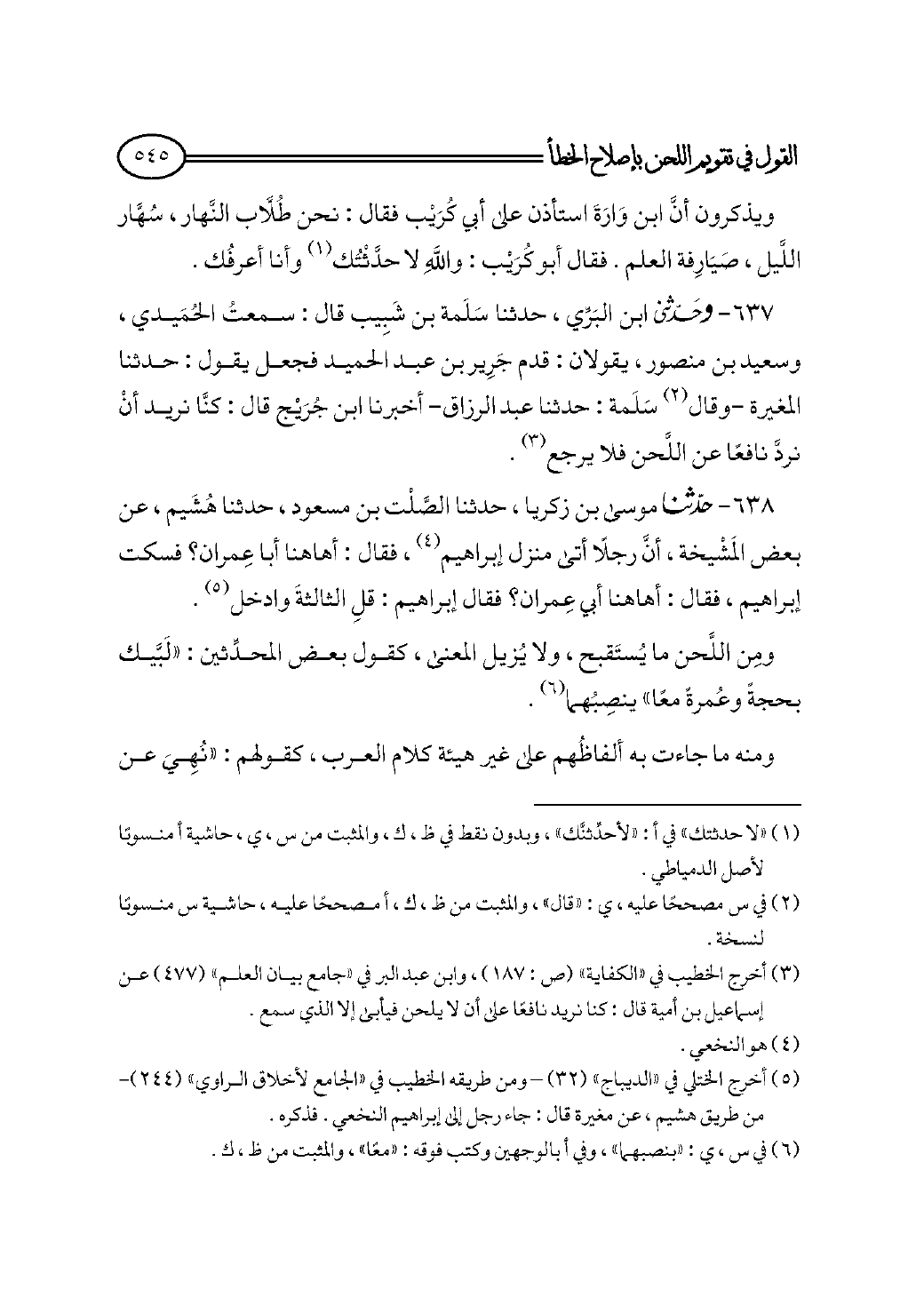 (¬٥) أخرج الختلي في «الديباج» (٣٢) - ومن طريقه الخطيب في «الجامع لأخلاق الراوي» (٢٤٤) - من طريق هشيم، عن مغيرة قال: جاء رجل إلى إبراهيم النخعي. فذكره.