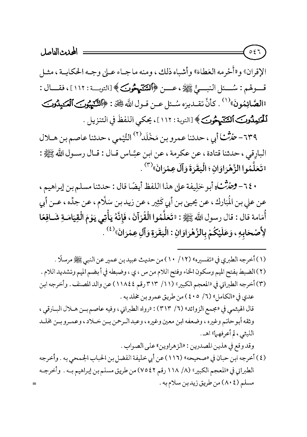 ٦٣٩ - حدثنا أبي، حدثنا عمرو بن مَخْلَد (¬٢) التَّيْمي، حدثنا عاصم بن هلال البارِقي، حدثنا قتادة، عن عكرمة، عن ابن عبَّاس قال: قال رسول الله - صلى الله عليه وسلم -: «تَعَلَّمُوا الزَّهْرَاوَانِ؛ الْبَقَرَةَ وَآلَ عِمْرَانَ» (¬٣).
