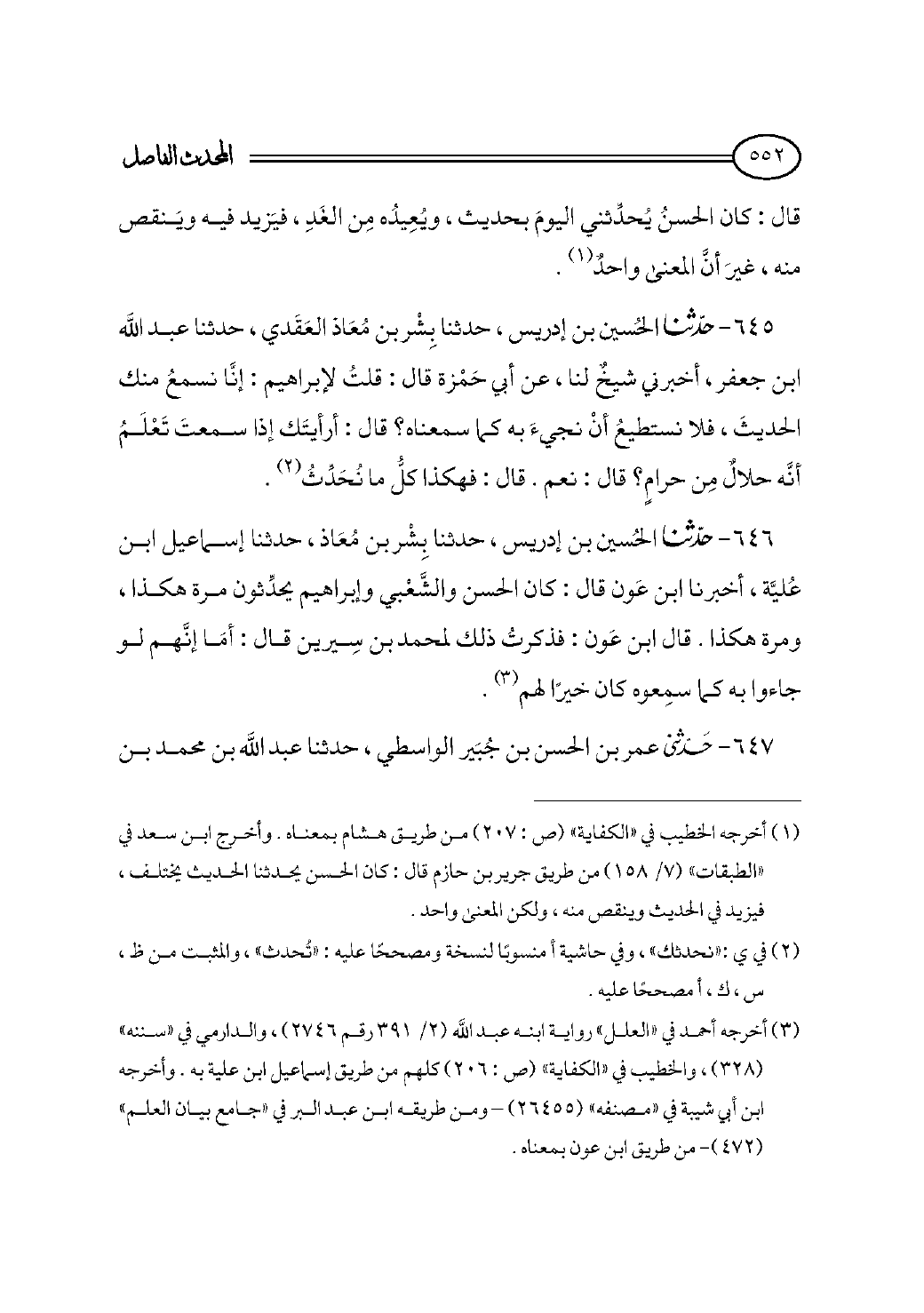 (¬٣) أخرجه أحمد في «العلل» رواية ابنه عبد الله (٢/ ٣٩١ رقم ٢٧٤٦)، والدارمي في «سننه» (٣٢٨)، والخطيب في «الكفاية» (ص: ٢٠٦) كلهم من طريق إسماعيل ابن علية به. وأخرجه ابن أبي شيبة في «مصنفه» (٢٦٤٥٥) - ومن طريقه ابن عبد البر في «جامع بيان العلم» (٤٧٢) - من طريق ابن عون بمعناه.