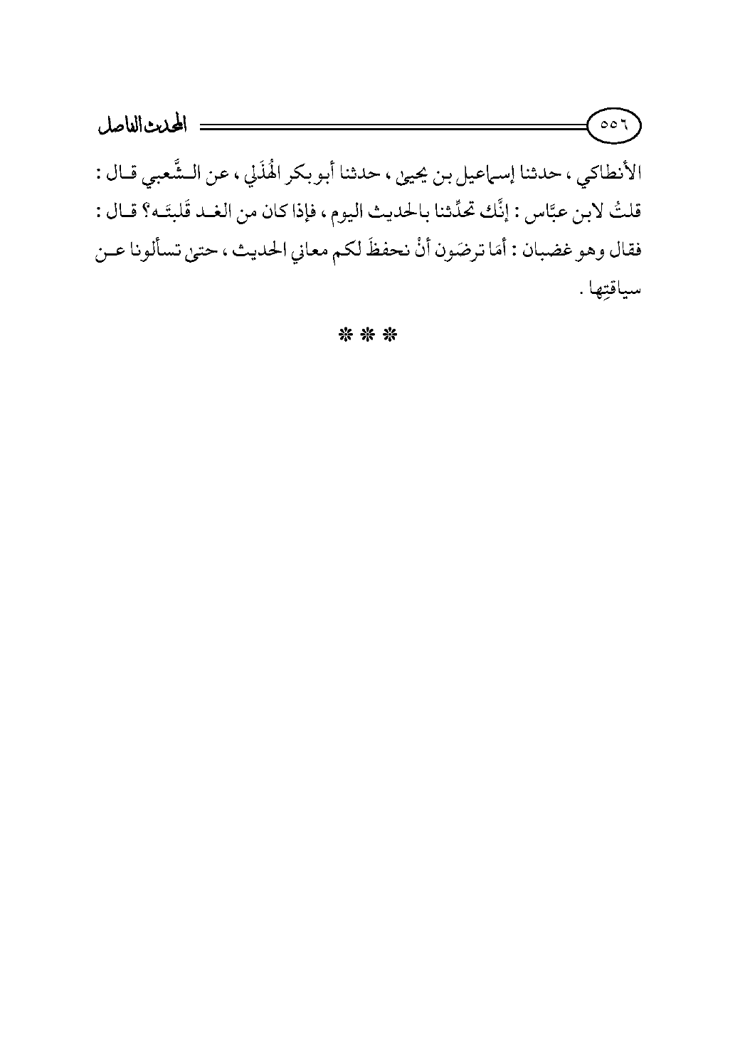 الأنطاكي، حدثنا إسماعيل بن يحيى، حدثنا أبو بكر الهُذَلي، عن الشَّعبي قال: قلتُ لابن عبَّاس: إنَّك تحدِّثنا بالحديث اليوم، فإذا كان من الغد قَلبتَه؟ قال: فقال وهو غضبان: أمَا ترضَون أنْ نحفظَ لكم معاني الحديث، حتى تسألونا عن سياقتِها.