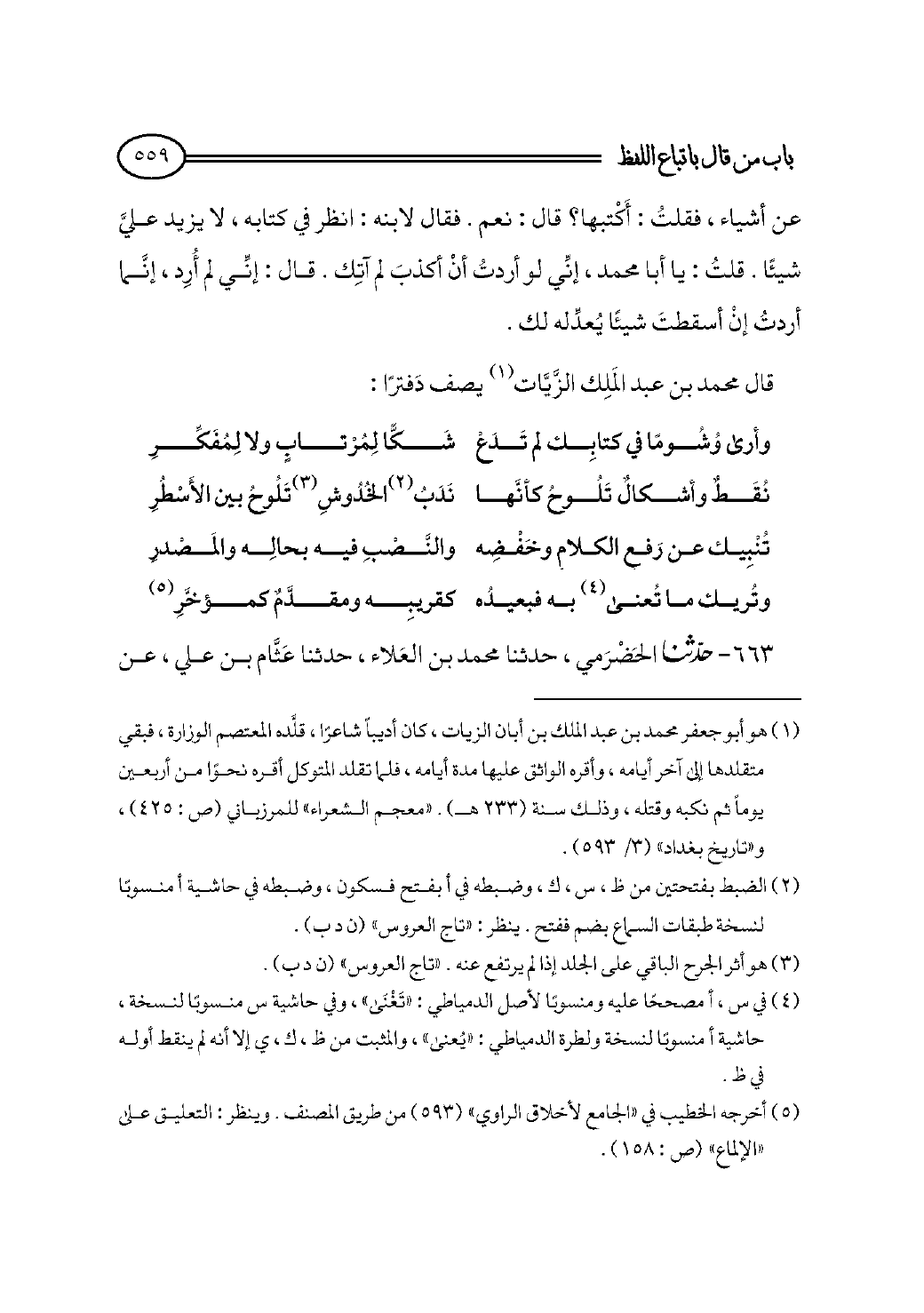 (¬١) هو أبو جعفر محمد بن عبد الملك بن أبان الزيات، كان أديباً شاعرًا، قلَّده المعتصم الوزارة، فبقي متقلدها إلى آخر أيامه، وأقره الواثق عليها مدة أيامه، فلما تقلد المتوكل أقره نحوًا من أربعين يوماً ثم نكبه وقتله، وذلك سنة (٢٣٣ هـ). «معجم الشعراء» للمرزباني (ص: ٤٢٥)، و «تاريخ بغداد» (٣/ ٥٩٣).
