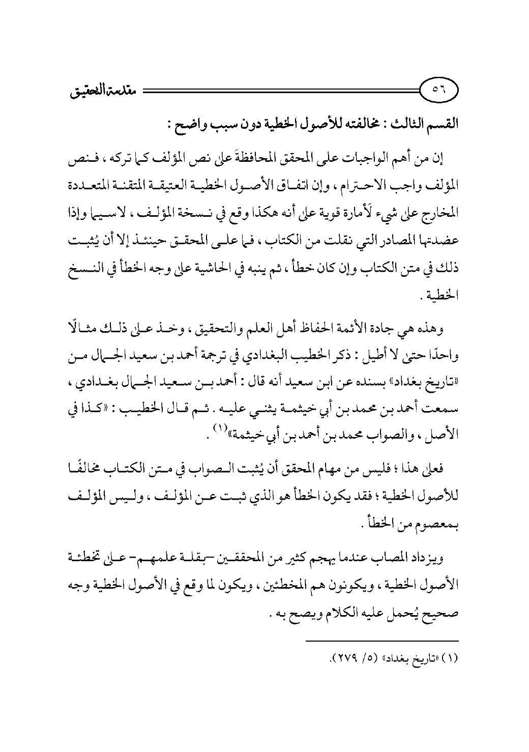 وهذه هي جادة الأئمة الحفاظ أهل العلم والتحقيق، وخذ على ذلك مثالًا واحدًا حتى لا أطيل: ذكر الخطيب البغدادي في ترجمة أحمد بن سعيد الجمال من «تاريخ بغداد» بسنده عن ابن سعيد أنه قال: أحمد بن سعيد الجمال بغدادي، سمعت أحمد بن محمد بن أبي خيثمة يثني عليه. ثم قال الخطيب: «كذا في الأصل، والصواب محمد بن أحمد بن أبي خيثمة» (¬١).