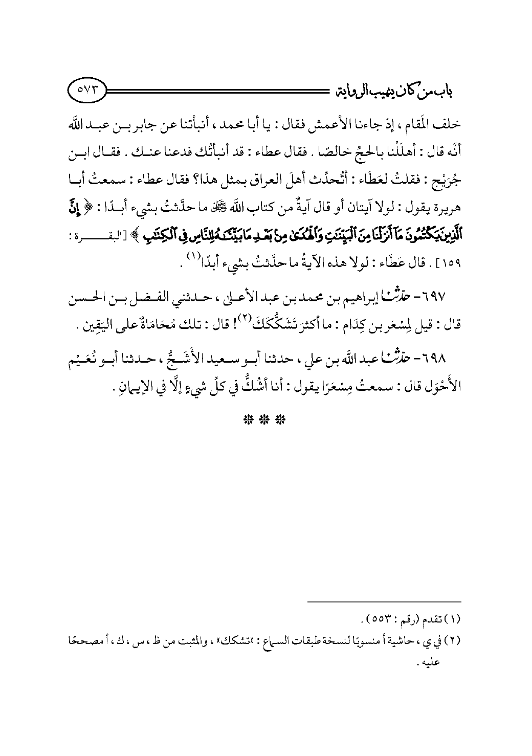 خلف المَقام، إذ جاءنا الأعمش فقال: يا أبا محمد، أنبأتنا عن جابر بن عبد الله أنَّه قال: أهلَلْنا بالحجِّ خالصًا. فقال عطاء: قد أنبأتُك فدعنا عنك. فقال ابن جُرَيْج: فقلتُ لعَطَاء: أتُحدِّث أهلَ العراق بمثل هذا؟ فقال عطاء: سمعتُ أبا هريرة يقول: لولا آيتان أو قال آيةٌ من كتاب الله - عز وجل - ما حدَّثتُ بشيء أبدًا: {إِنَّ الَّذِينَ يَكْتُمُونَ مَا أَنْزَلْنَا مِنَ الْبَيِّنَاتِ وَالْهُدَى مِنْ بَعْدِ مَا بَيَّنَّاهُ لِلنَّاسِ فِي الْكِتَابِ} [البقرة: ١٥٩]. قال عَطَاء: لولا هذه الآيةُ ما حدَّثتُ بشيء أبدًا (¬١).