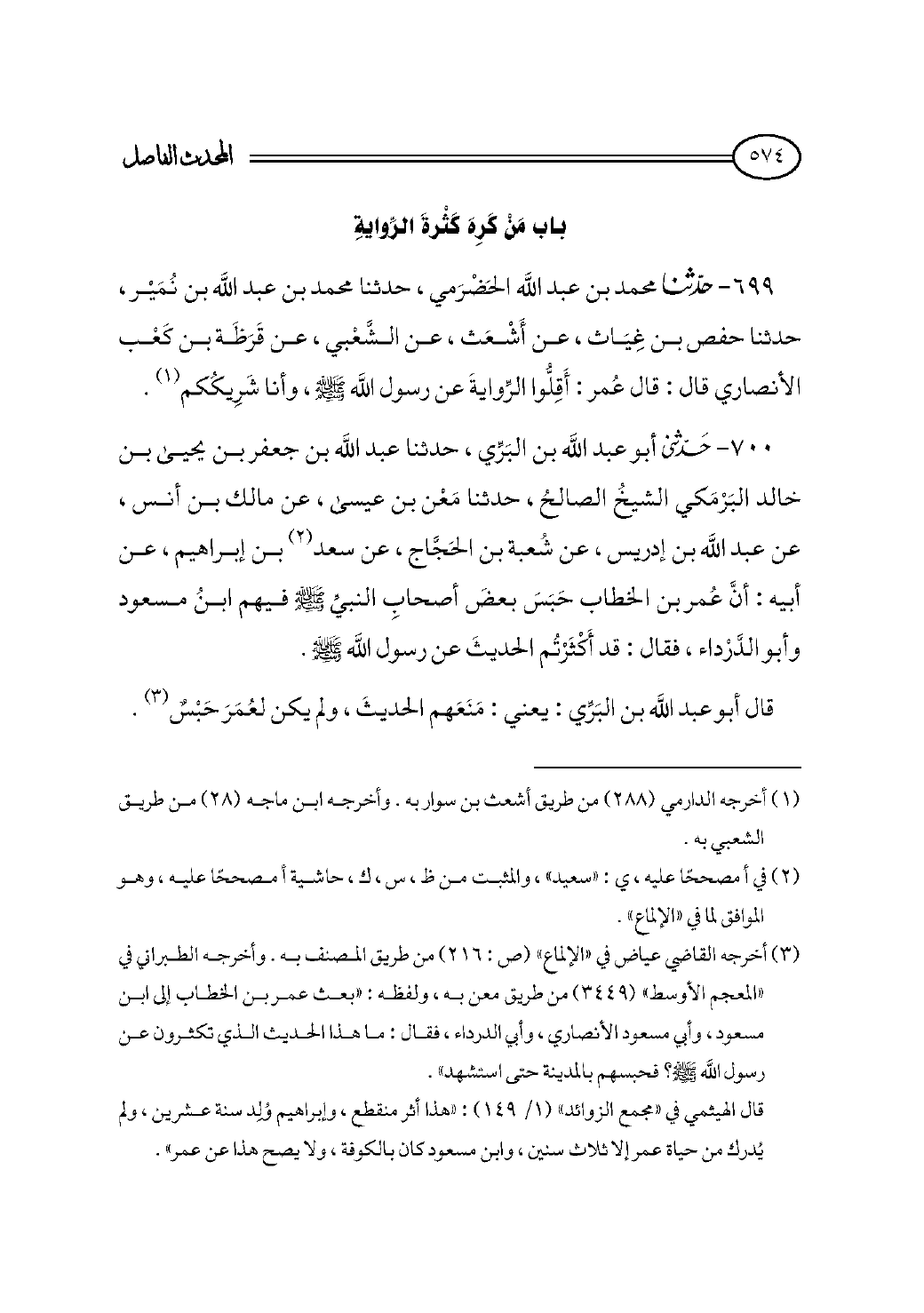 ٦٩٩ - حدثنا محمد بن عبد الله الحَضْرَمي، حدثنا محمد بن عبد الله بن نُمَيْر، حدثنا حفص بن غِيَاث، عن أَشْعَث، عن الشَّعْبي، عن قَرَظَة بن كَعْب الأنصاري قال: قال عُمر: أَقِلُّوا الرِّوايةَ عن رسول الله - صلى الله عليه وسلم -، وأنا شَرِيكُكم (¬١).