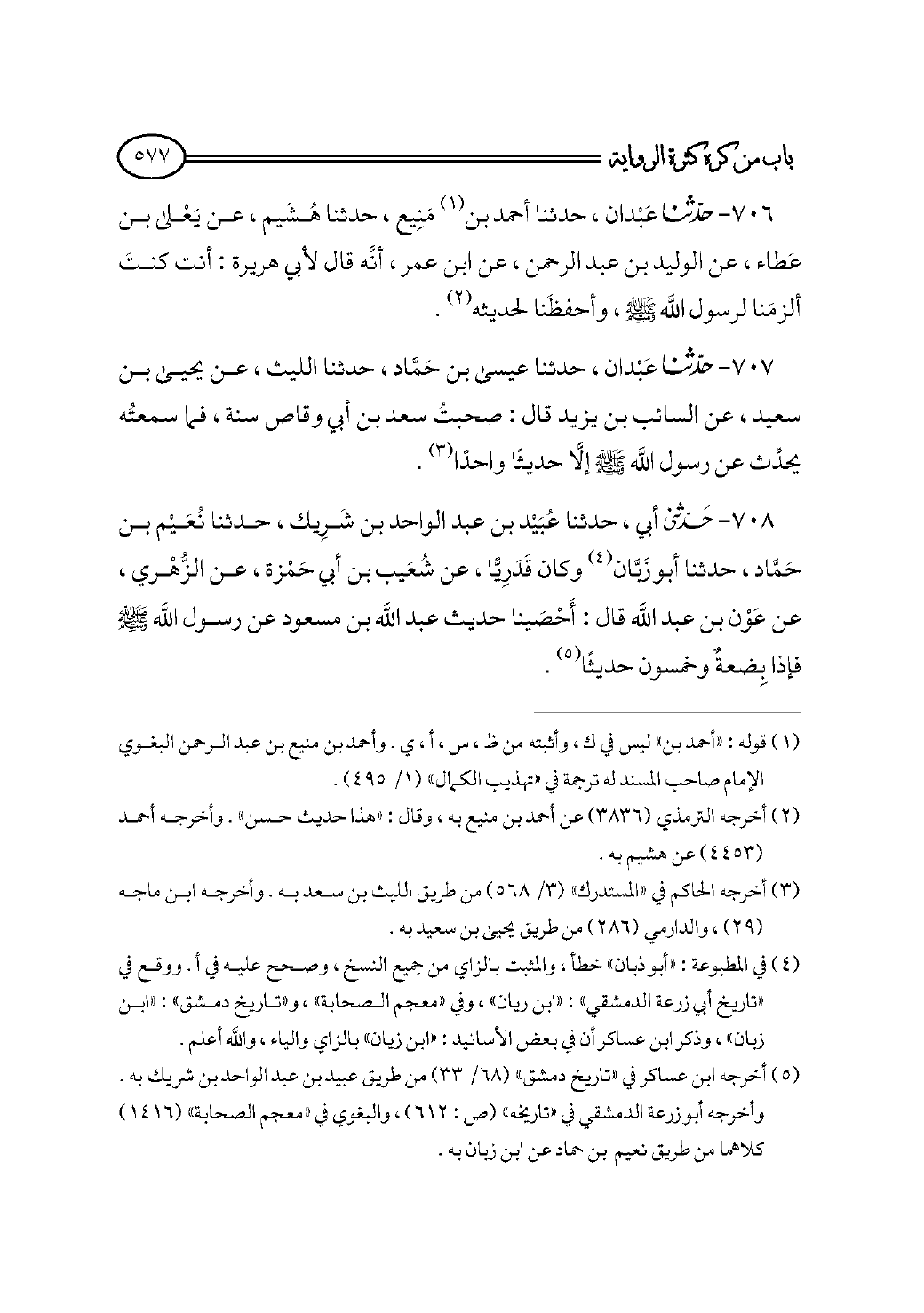 ٧٠٦ - حدثنا عَبْدان، حدثنا أحمد بن (¬١) مَنِيع، حدثنا هُشَيم، عن يَعْلى بن عَطاء، عن الوليد بن عبد الرحمن، عن ابن عمر، أنَّه قال لأبي هريرة: أنت كنتَ ألزمَنا لرسول الله - صلى الله عليه وسلم -، وأحفظَنا لحديثه (¬٢).