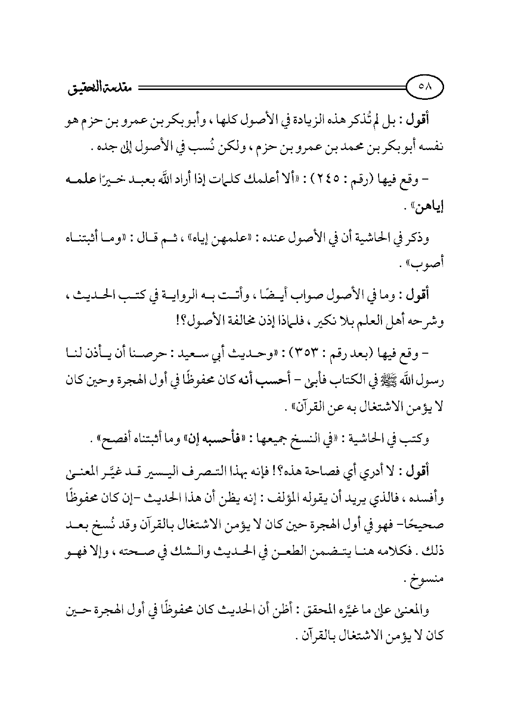 أقول: لا أدري أي فصاحة هذه؟ ! فإنه بهذا التصرف اليسير قد غيَّر المعنى وأفسده، فالذي يريد أن يقوله المؤلف: إنه يظن أن هذا الحديث -إن كان محفوظًا صحيحًا- فهو في أول الهجرة حين كان لا يؤمن الاشتغال بالقرآن وقد نُسخ بعد ذلك. فكلامه هنا يتضمن الطعن في الحديث والشك في صحته، وإلا فهو منسوخ.