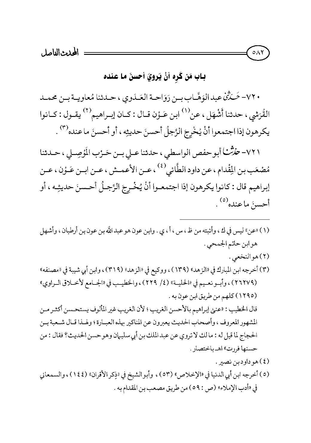 ٧٢١ - حدثنا أبو حفص الواسطي، حدثنا علي بن حَرْب المَوْصِلي، حدثنا مُصْعَب بن المِقْدام، عن داود الطَّائي (¬٤)، عن الأعمش، عن ابن عَوْن، عن إبراهيم قال: كانوا يكرهون إذا اجتمعوا أنْ يُخْرِجَ الرَّجلُ أحسنَ حديثِه، أو أحسنَ ما عنده (¬٥).