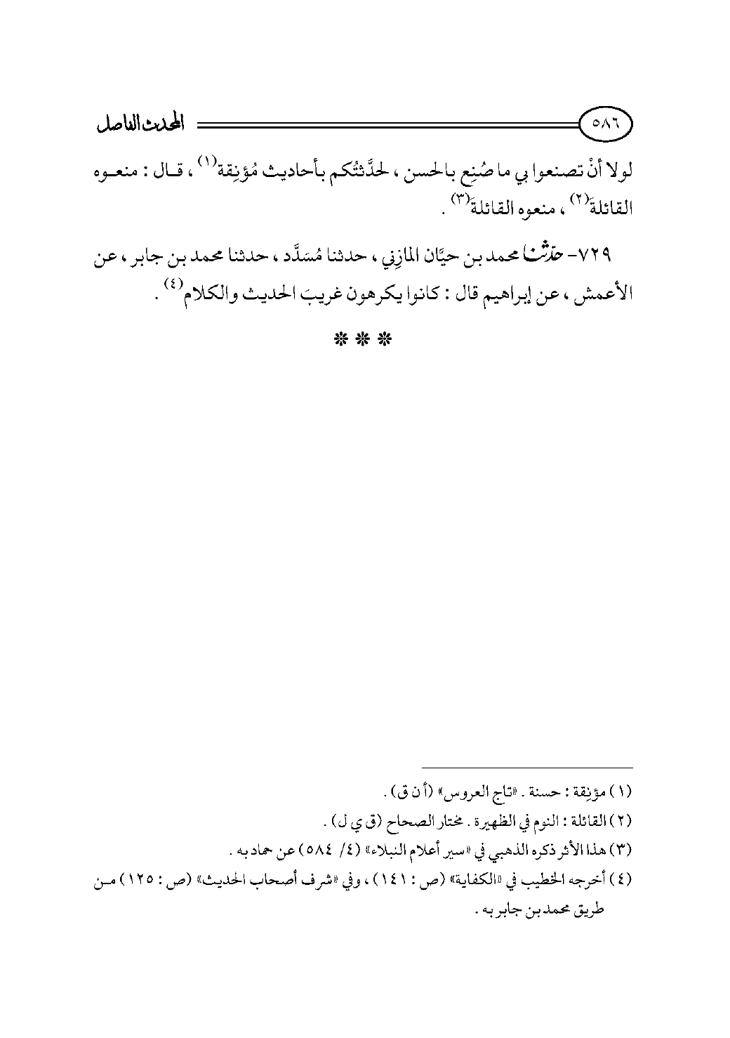 ٧٢٩ - حدثنا محمد بن حيَّان المازِني، حدثنا مُسَدَّد، حدثنا محمد بن جابر، عن الأعمش، عن إبراهيم قال: كانوا يكرهون غريبَ الحديث والكلام (¬٤).