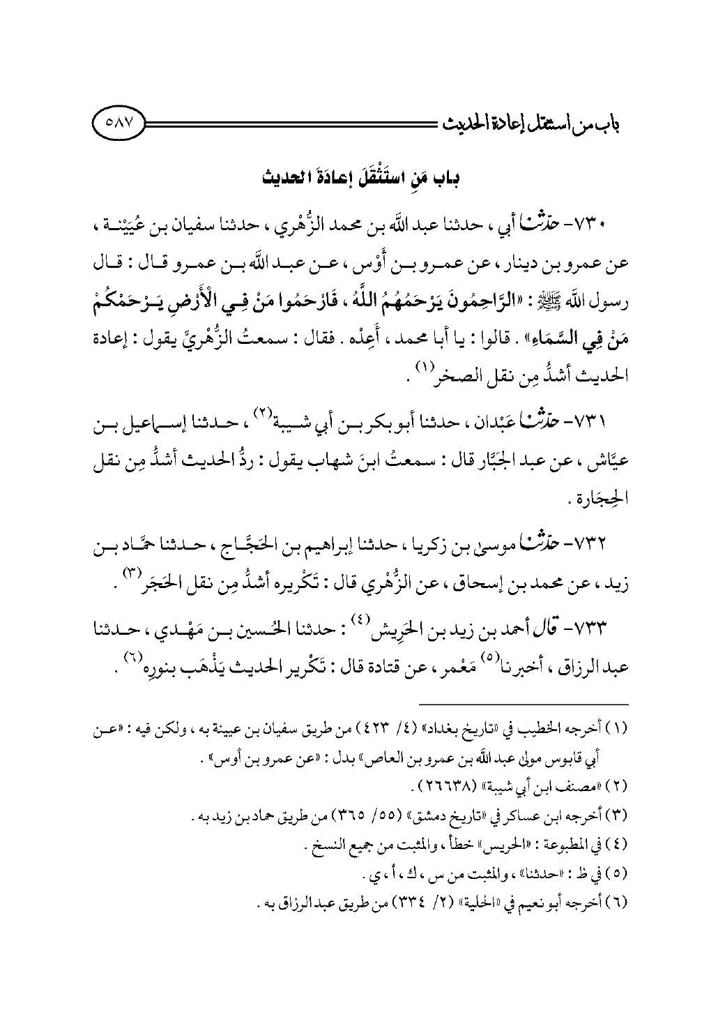 ٧٣٠ - حدثنا أبي، حدثنا عبد الله بن محمد الزُّهْري، حدثنا سفيان بن عُيَيْنة، عن عمرو بن دينار، عن عمرو بن أَوْس، عن عبد الله بن عمرو قال: قال رسول الله - صلى الله عليه وسلم - : «الرَّاحِمُونَ يَرْحَمُهُمُ اللَّهُ، فَارْحَمُوا مَنْ فِي الْأَرْضِ يَرْحَمْكُمْ مَنْ فِي السَّمَاءِ». قالوا: يا أبا محمد، أَعِدْه. فقال: سمعتُ الزُّهْريَّ يقول: إعادة الحديث أشدُّ مِن نقل الصخر (¬١).