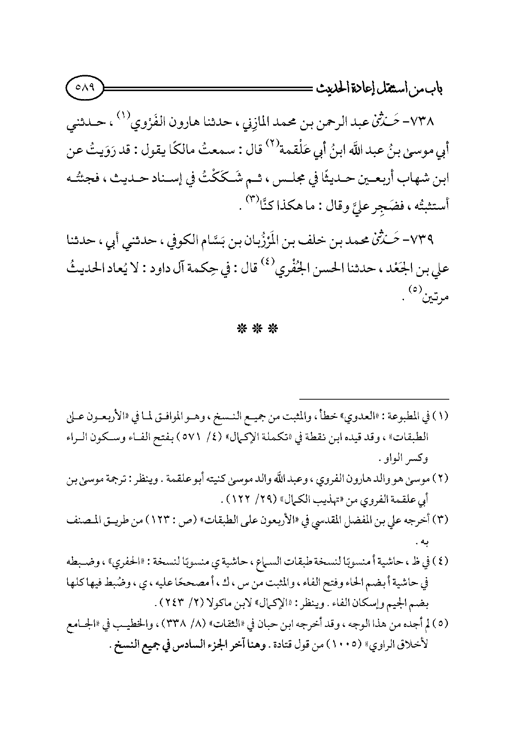 ٧٣٩ - حدثني محمد بن خلف بن المَرْزُبان بن بَسَّام الكوفي، حدثني أبي، حدثنا علي بن الجَعْد، حدثنا الحسن الجُفْري (¬٤) قال: في حِكمة آل داود: لا يُعاد الحديثُ مرتين (¬٥).