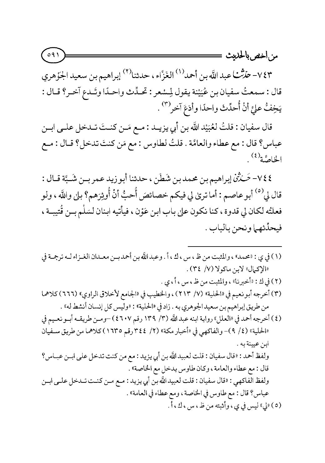 ولفظ أحمد: «قال سفيان: قلت لعبيد الله بن أبي يزيد: مع من كنت تدخل على ابن عباس؟ قال: مع عطاء والعامة، وكان طاوس يدخل مع الخاصة».