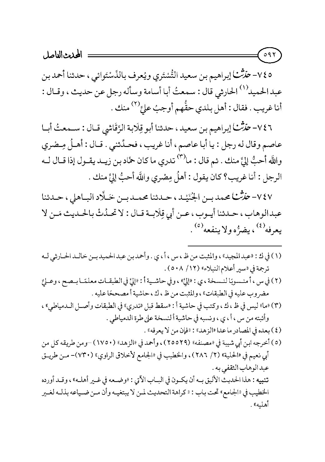 ٧٤٦ - حدثنا إبراهيم بن سعيد، حدثنا أبو قِلَابة الرَّقَاشي قال: سمعتُ أبا عاصم وقال له رجل: يا أبا عاصم، أنا غريب، فحدِّثني. قال: أهلُ مِصْري والله أحبُّ إليَّ منك. ثم قال: ما (¬٣) تدري ما كان حمَّاد بن زيد يقول إذا قال له الرجل: أنا غريب؟ كان يقول: أهلُ مِصْري والله أحبُّ إليَّ منك.