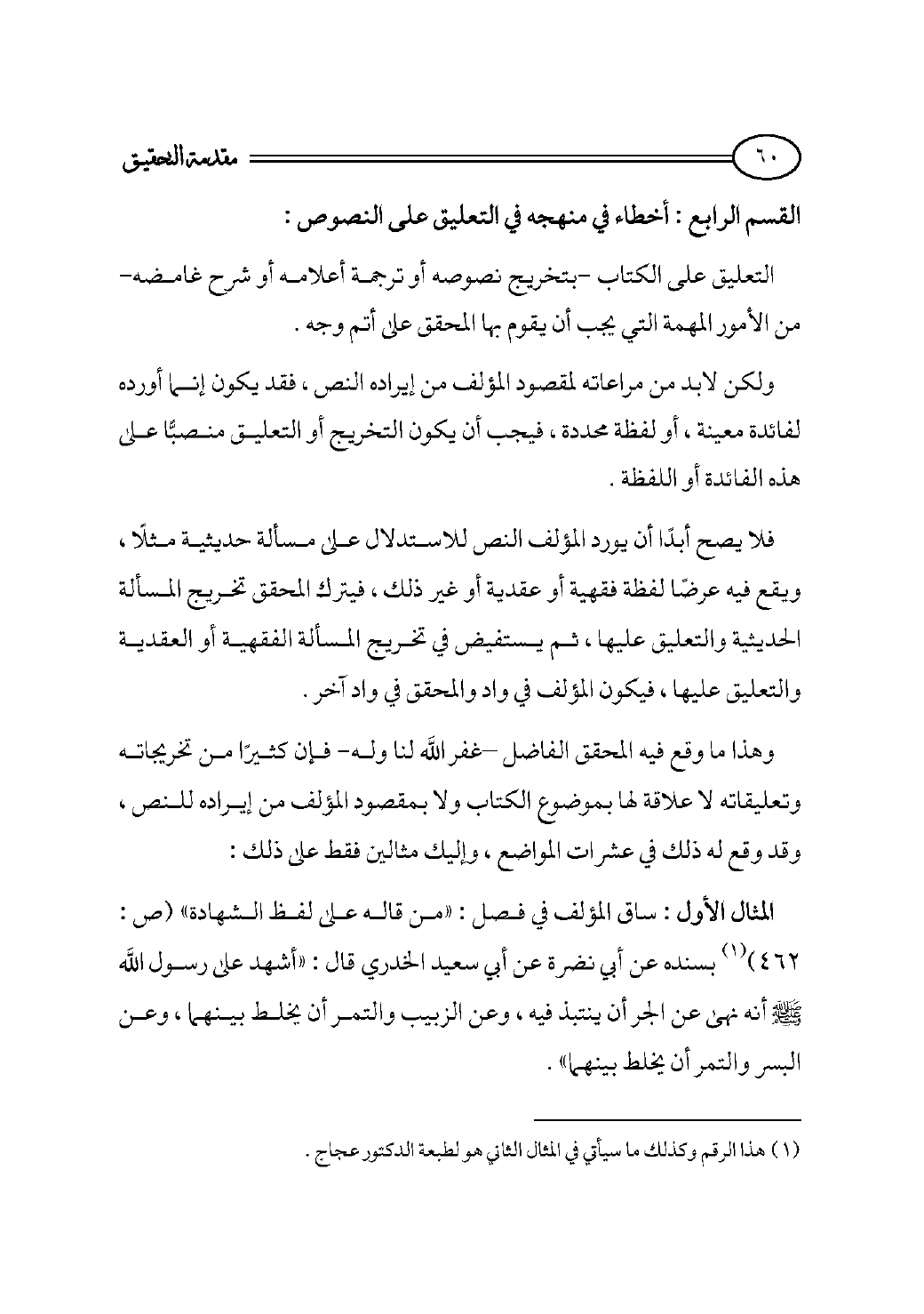 وهذا ما وقع فيه المحقق الفاضل -غفر الله لنا وله- فإن كثيرًا من تخريجاته وتعليقاته لا علاقة لها بموضوع الكتاب ولا بمقصود المؤلف من إيراده للنص، وقد وقع له ذلك في عشرات المواضع، وإليك مثالين فقط على ذلك: