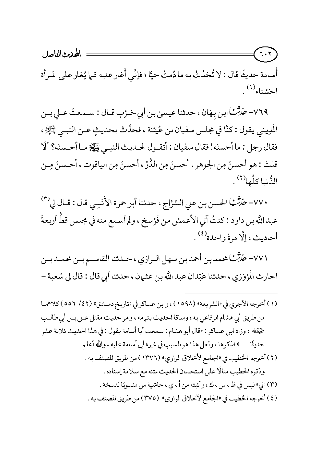 ٧٦٩ - حدثنا ابن بِهَان، حدثنا عيسى بن أبي حَرْب قال: سمعتُ علي بن المَدِيني يقول: كنَّا في مجلس سفيان بن عُيَيْنة، فحدَّثَ بحديثٍ عن النبي - صلى الله عليه وسلم - ، فقال رجل: ما أحسنَه! فقال سفيان: أتقول لحديث النبي - صلى الله عليه وسلم - ما أحسنَه؟ ألَا قلتَ: هو أحسنُ مِن الجوهر، أحسنُ مِن الدُّرِّ، أحسنُ مِن الياقوت، أحسنُ مِن الدُّنيا كلِّها (¬٢).