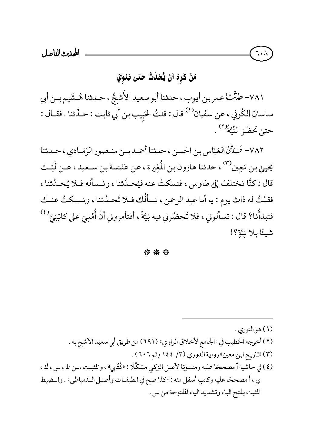 ٧٨١ - حدثنا عمر بن أيوب، حدثنا أبو سعيد الأَشَجُّ، حدثنا هُشَيم بن أبي ساسان الكُوفي، عن سفيان (¬١) قال: قلتُ لحَبِيب بن أبي ثابت: حدِّثنا. فقال: حتى تحضُرَ النِّيَّةُ (¬٢).