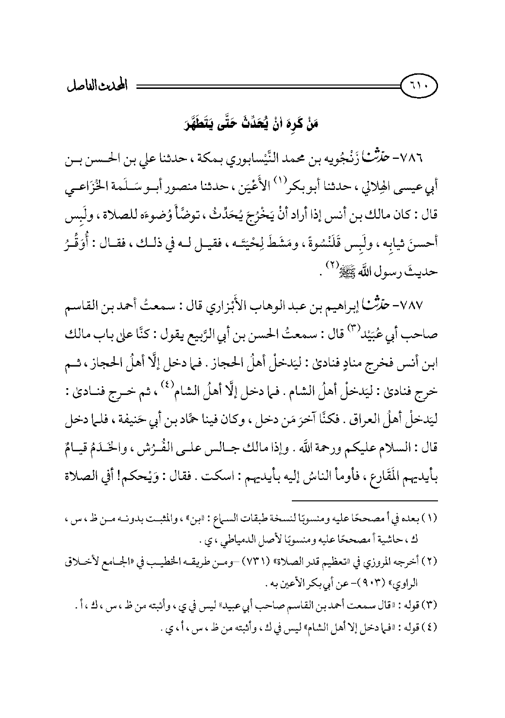 ٧٨٦ - حدثنا زَنْجُويه بن محمد النَّيْسابوري بمكة، حدثنا علي بن الحسن بن أبي عيسى الهِلالي، حدثنا أبو بكر (¬١) الأَعْيَن، حدثنا منصور أبو سَلَمة الخُزَاعي قال: كان مالك بن أنس إذا أراد أنْ يَخْرُجَ يُحَدِّثُ، توضَّأَ وُضوءَه للصلاة، ولَبِس أحسنَ ثيابِه، ولَبِس قَلَنْسُوةً، ومَشَطَ لِحْيَتَه، فقيل له في ذلك، فقال: أُوَقِّرُ حديثَ رسول الله - صلى الله عليه وسلم - (¬٢).