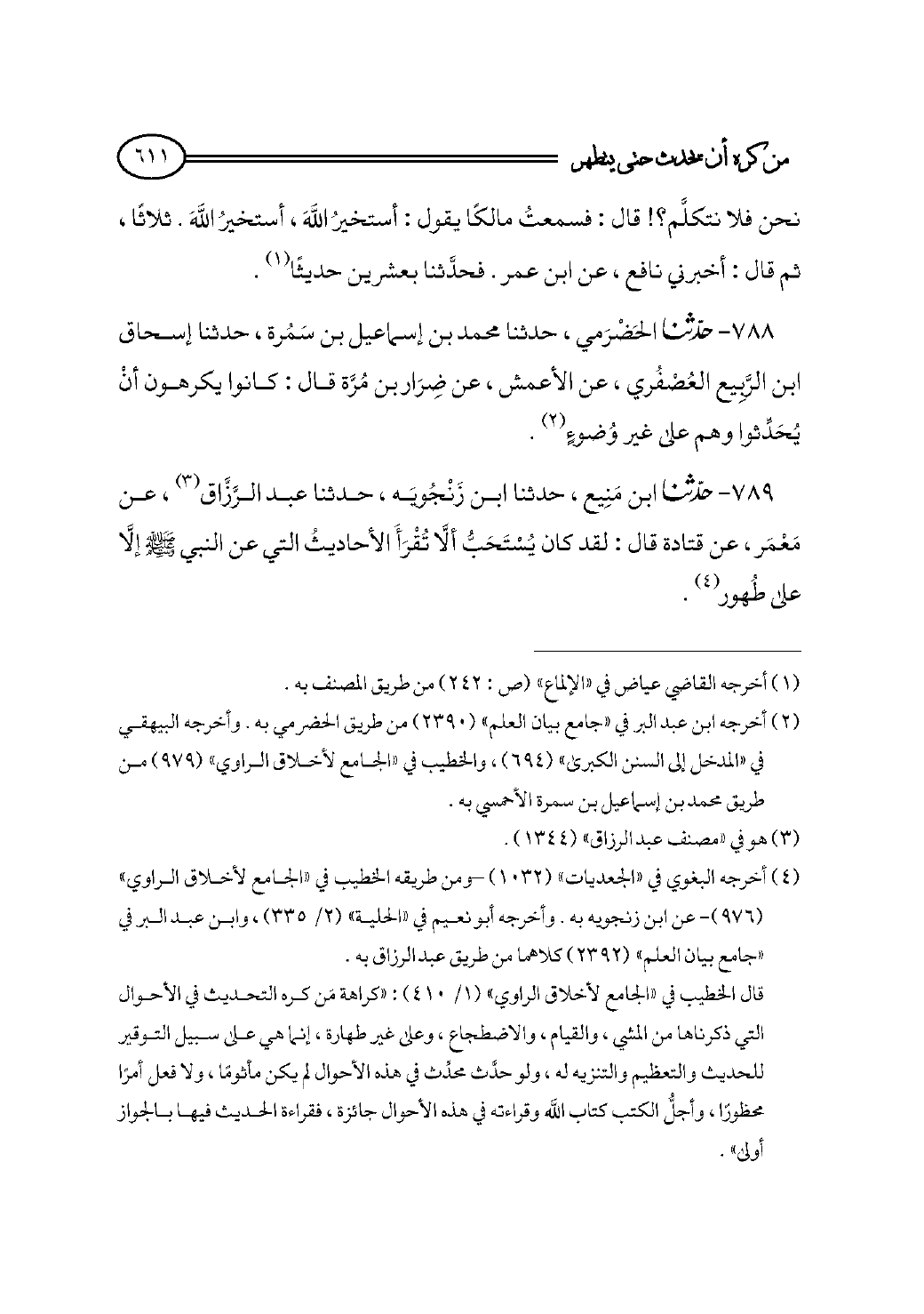 قال الخطيب في «الجامع لأخلاق الراوي» (١/ ٤١٠): «كراهة مَن كره التحديث في الأحوال التي ذكرناها من المشي، والقيام، والاضطجاع، وعلى غير طهارة، إنما هي على سبيل التوقير للحديث والتعظيم والتنزيه له، ولو حدَّث محدِّث في هذه الأحوال لم يكن مأثومًا، ولا فعل أمرًا محظورًا، وأجلُّ الكتب كتاب الله وقراءته في هذه الأحوال جائزة، فقراءة الحديث فيها بالجواز أولى».