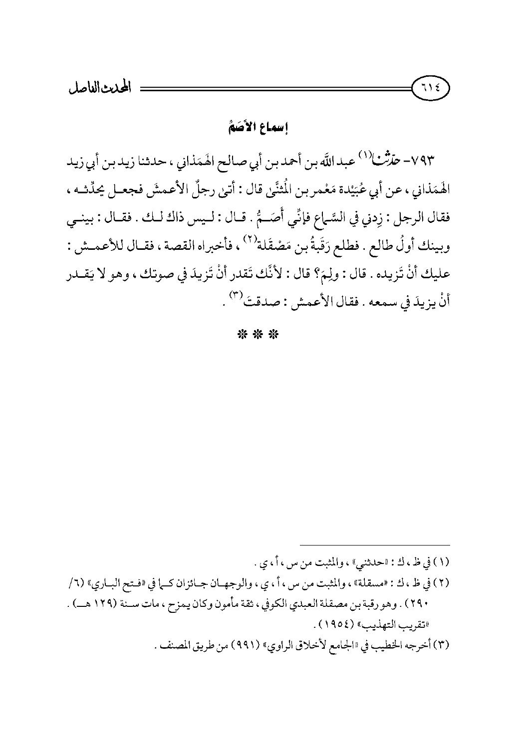 ٧٩٣ - حدثنا (¬١) عبد الله بن أحمد بن أبي صالح الهَمَذاني، حدثنا زيد بن أبي زيد الهَمَذاني، عن أبي عُبَيْدة مَعْمر بن المُثنَّى قال: أتى رجلٌ الأعمشَ فجعل يحدِّثه، فقال الرجل: زِدني في السَّماع فإنِّي أَصَمُّ. قال: ليس ذاك لك. فقال: بيني وبينك أولُ طالع. فطلع رَقَبةُ بن مَصْقَلة (¬٢)، فأخبراه القصة، فقال للأعمش: عليك أنْ تَزيده. قال: ولِمَ؟ قال: لأنَّك تَقدر أنْ تَزيدَ في صوتك، وهو لا يَقدر أنْ يزيدَ في سمعه. فقال الأعمش: صدقتَ (¬٣).