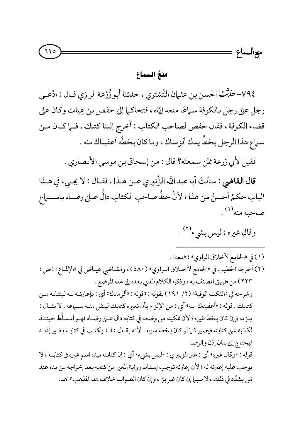 ٧٩٤ - حدثنا الحسن بن عثمان التُّسْتَري، حدثنا أبو زُرْعة الرازي قال: ادَّعى رجل على رجل بالكوفة سماعًا منعه إيَّاه، فتحاكما إلى حفص بن غِيَاث وكان على قضاء الكوفة، فقال حفص لصاحب الكتاب: أَخرج إلينا كتبَك، فما كان من سماع هذا الرجل بخطِّ يدك ألزمناك، وما كان بخطِّه أعفيناك منه.